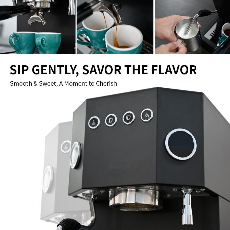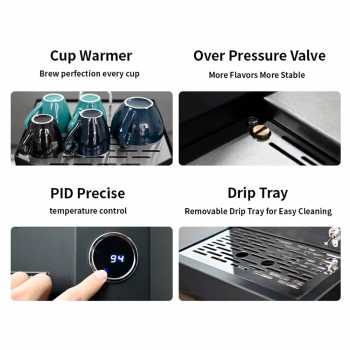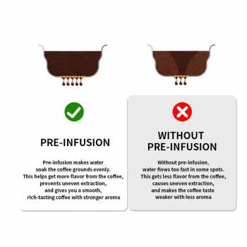| Pre-Infusion / Pre-Soaking System Fitur pre-infusion membasahi bubuk kopi secara perlahan sebelum tekanan penuh diterapkan. Proses ini membuat coffee puck mengembang merata dan mengurangi risiko channeling. Ekstraksi menjadi lebih konsisten dengan rasa yang lebih halus dan kompleks. |