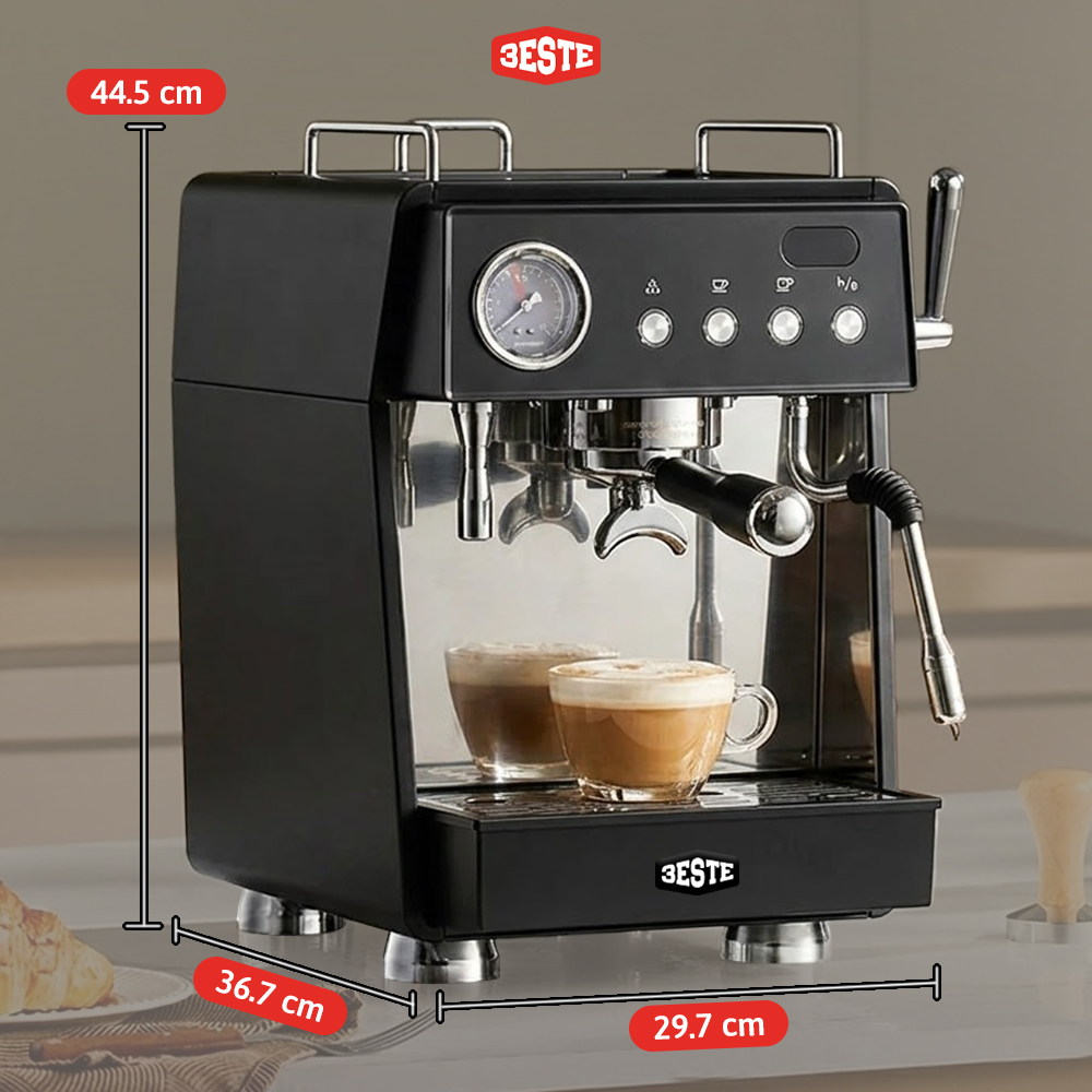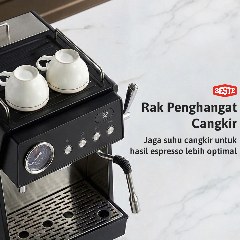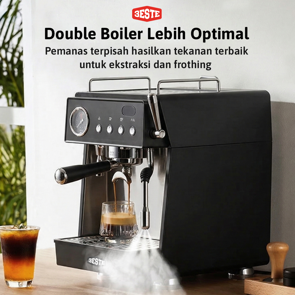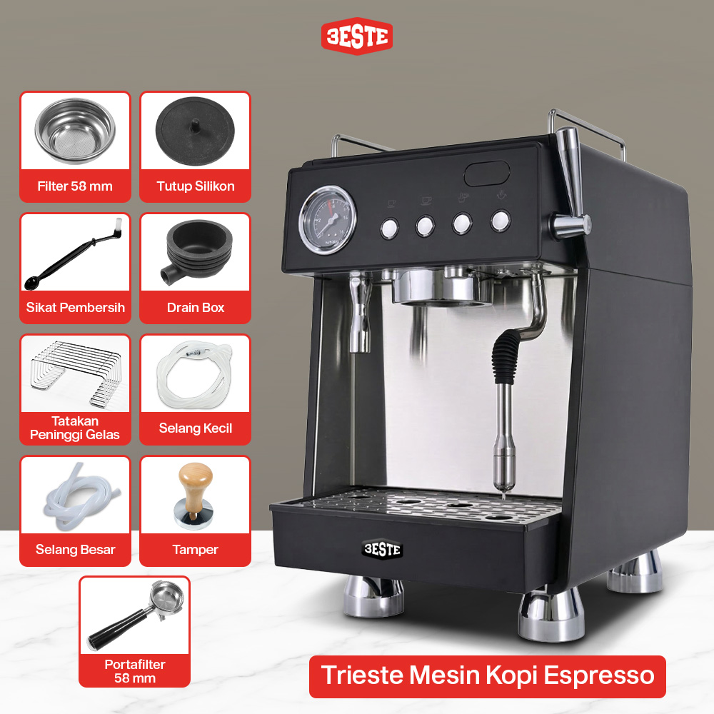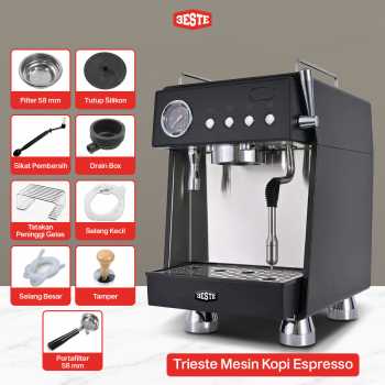 Nikmati sajian kopi ala cafe dari rumah dengan menggunakan mesin kopi Trieste. Mesin bertekanan 15 bar dan teknologi pre-soaking hasilkan espresso dengan crema kaya rasa. Buat aneka kreasi kopi lebih praktis dengan steam wand 3 lubang untuk hasilkan buih susu lembut. Kombinasi double boiler terpisah dan pompa standar Italia hasilkan tekanan optimal untuk proses ekstraksi dan frothing susu dengan hasil maksimal. Hadir dengan desain elegan yang membuatnya cocok untuk melengkapi dekorasi dapur hingga cafe.
