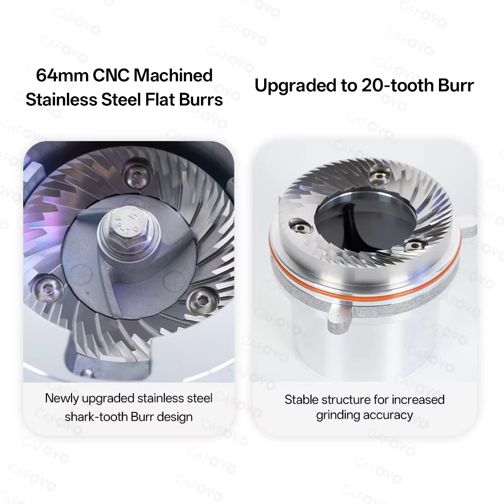 | Flat Burr 64 mm, Gilingan Konsisten Menggunakan flat burr plasma berdiameter 64 mm berbahan stainless steel yang tajam, sangat tahan aus, dan menghasilkan lebih sedikit panas. Desain pisau ini memastikan ukuran partikel bubuk kopi seragam, sehingga profil rasa, body, dan aroma kopi tetap terjaga optimal. |