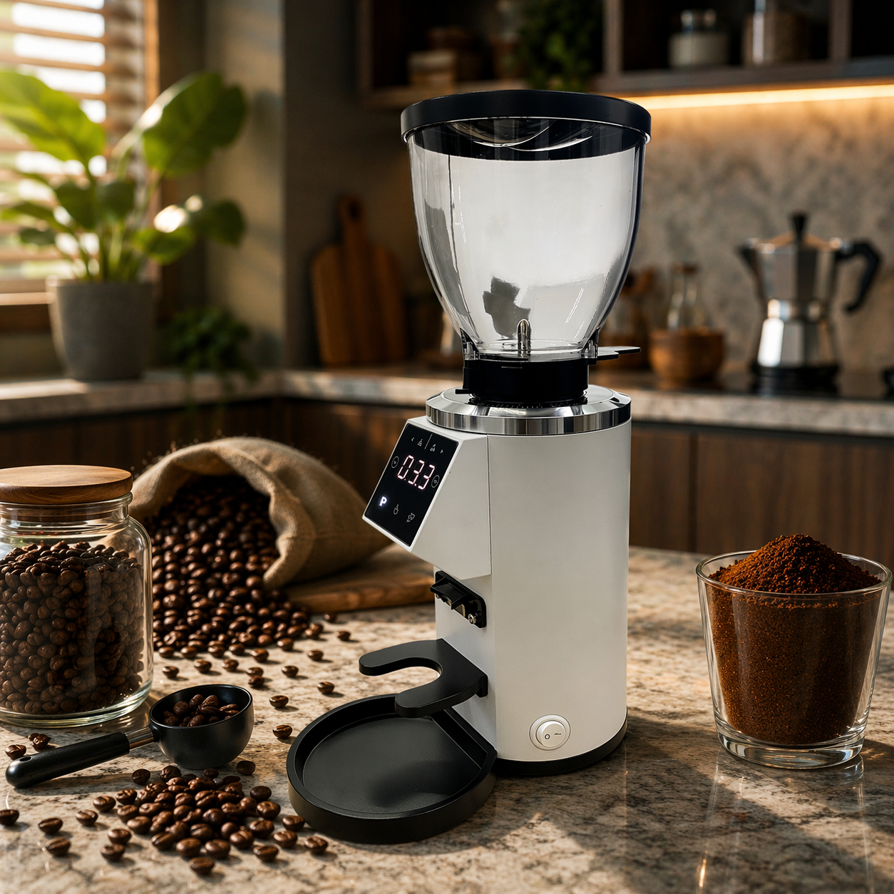 | Giling Langsung ke Portafilter Dilengkapi dengan holder khusus untuk portafiler dengan penyesuaian tinggi. Fitur ini juga membantu mengurangi pemborosan kopi dengan memastikan gilingan langsung jatuh ke portafilter tanpa tumpah, mempercepat proses penggilingan dan menjaga kebersihan area kerja. |