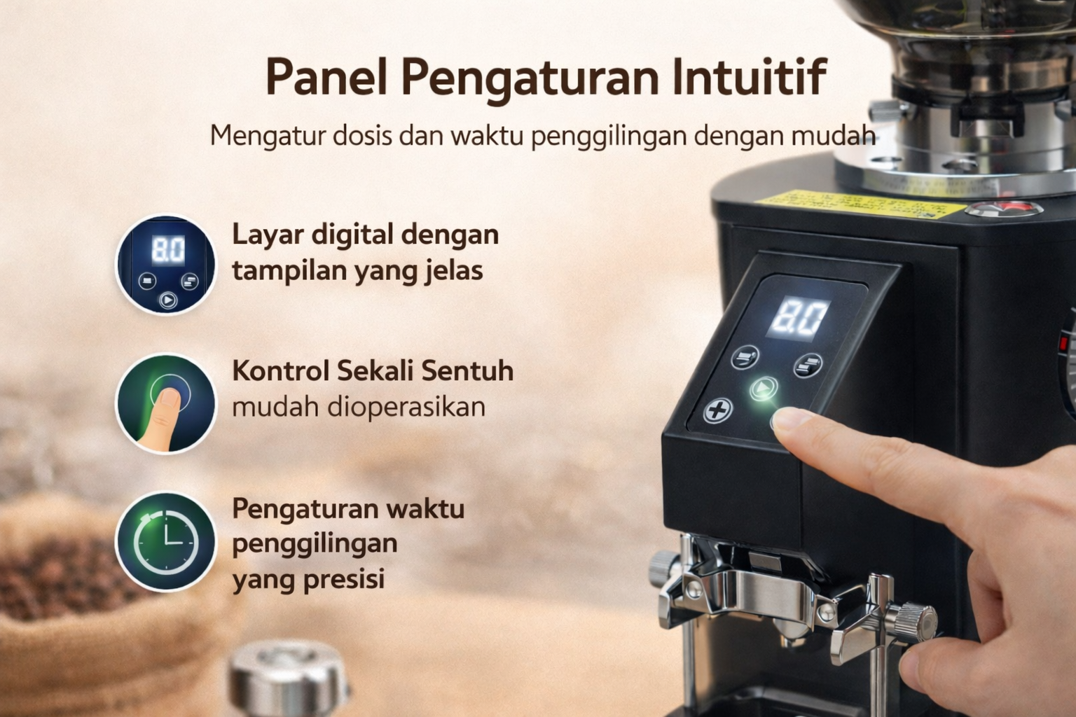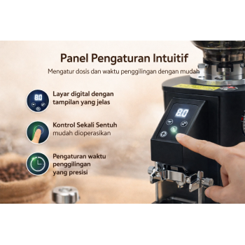 | Panel Pengaturan Intuitif Dilengkapi dengan panel dan tombol intuitif, grinder ini menampilkan informasi pengaturan secara visual dan mudah dibaca. Pengaturan waktu, takaran, dan mode single atau double cup dapat dilakukan dengan sentuhan ringan, meningkatkan efisiensi kerja dan konsistensi hasil gilingan. |