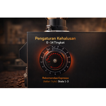 | Atur Tekstur Sesuai Selera Penggiling biji kopi memiliki sistem pengaturan grind size 14 level yang presisi dan mudah disesuaikan, memungkinkan Anda menentukan tingkat kehalusan dari coarse hingga fine sesuai kebutuhan. Cocok untuk berbagai metode seduh seperti espresso, americano, pour over, V60, hingga French press. |