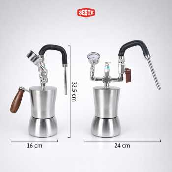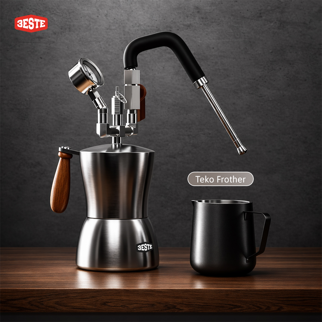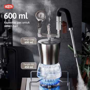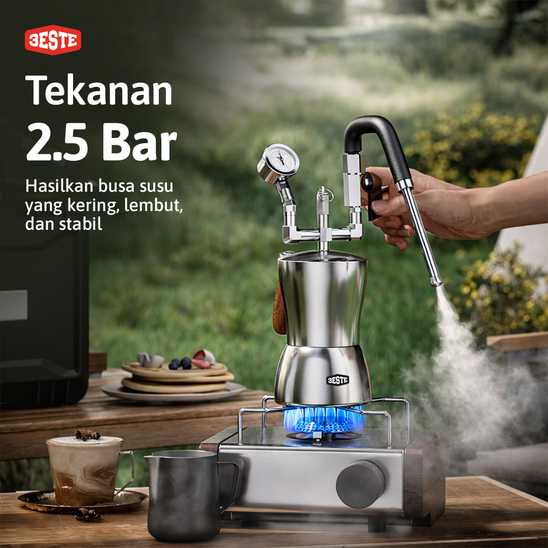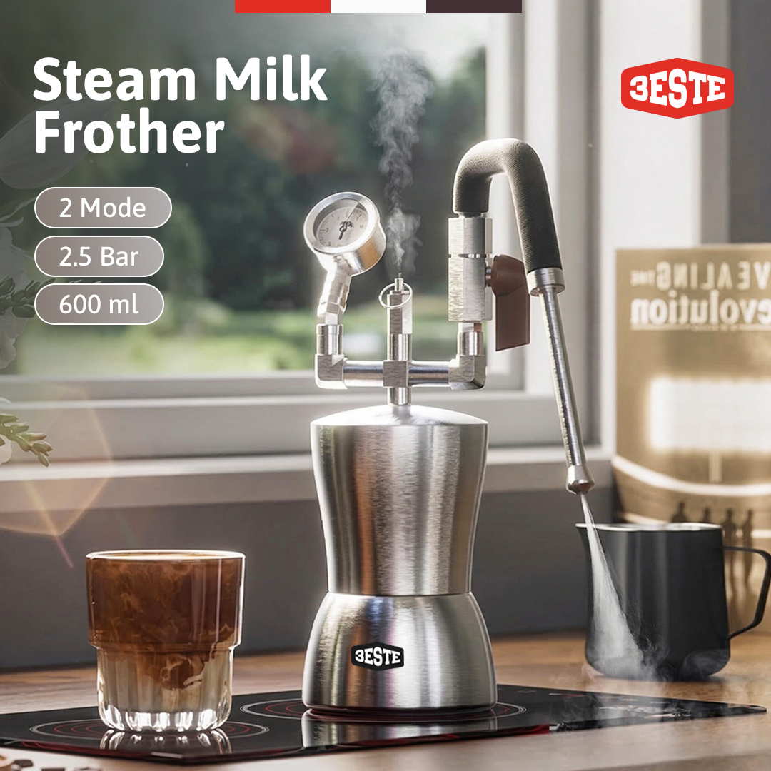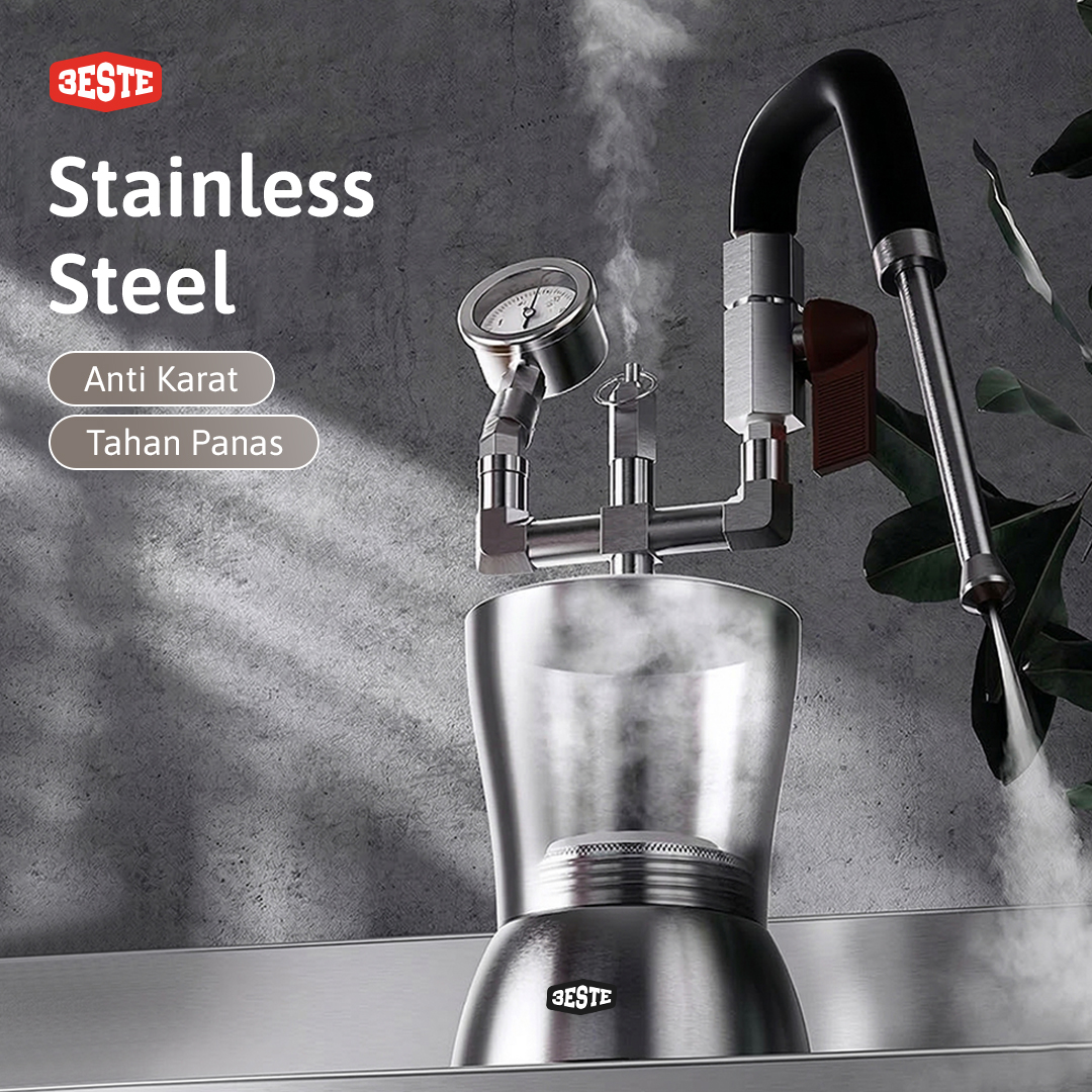 Hasilkan sajian cappucino atau latte yang creamy menggunakan steam milk frother dari Trieste. Alat ini bisa Anda gunakan bersama pemanas elektrik atau kompor gas untuk menghasilkan uap untuk keperluan frothing. Dry steam bertekanan tinggi yang dikeluarkan melalui frother head 3 lubang dapat menghasilkan busa susu yang lebih kering, lembut, dan stabil. Tekanan frothernya pun bisa Anda atur melalui tuas yang tersedia.