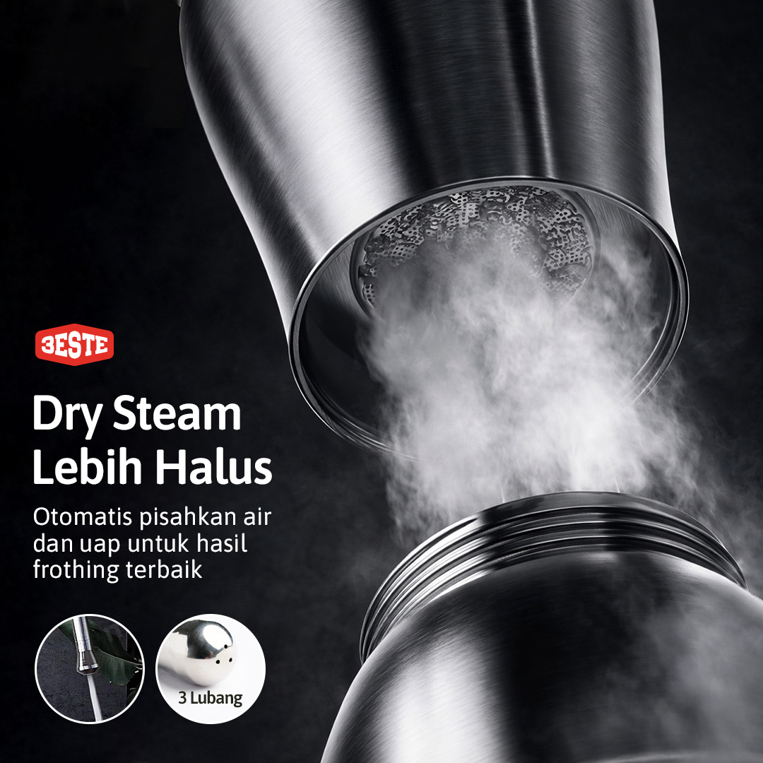 | Hasilkan Dry Steam Otomatis Untuk menghasilkan busa yang lebih halus, maka penggunaan dry steam pada milk frother ini sudah sangat tepat. Air dan uapnya dipisahkan melalui filter untuk menghasilkan dry steam. Dry steam tidak meninggalkan banyak tetesan air pada susu, busanya pun menjadi lebih kering, lembut, dan stabil. Mikrofoam yang dihasilkan sangat cocok untuk latte art atau minuman berbasis espresso. |