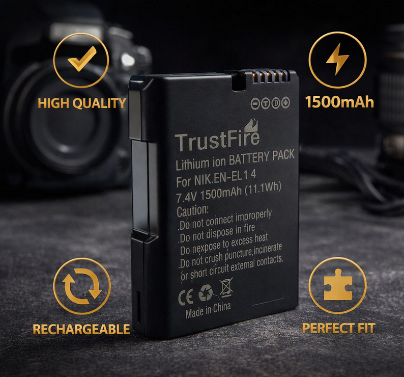 Ingin kamera tetap aktif saat momen penting tanpa takut kehabisan daya? Baterai Nikon EN-EL14 ini dirancang sebagai solusi andal untuk fotografer. Kapasitas 1500 mAh yang besar membuat Anda bisa memotret lebih lama tanpa sering ganti baterai. Bisa dijadikan baterai cadangan, terbuat dari material berkualitas, dan kompatibel dengan berbagai model kamera Nikon.