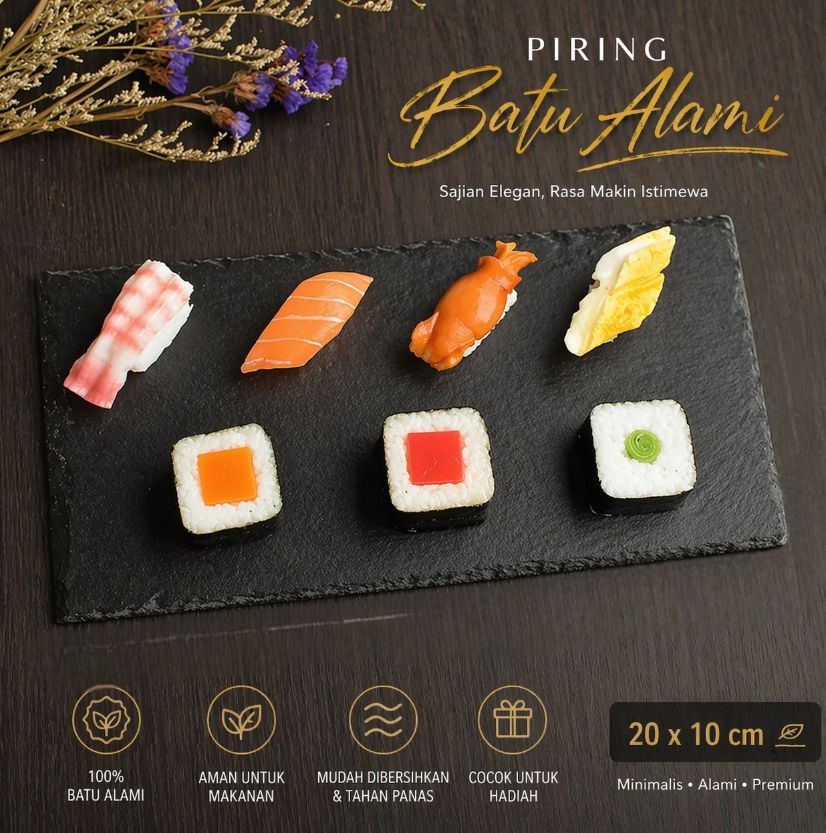 Piring batu alam Uibqut hadir dengan tampilan mewah, tekstur unik, dan ketahanan tinggi. Tersedia dalam enam ukuran. Cocok untuk berbagai hidangan, dari sushi hingga steak dan mudah dibersihkan. Ideal untuk sajian artistik dan elegan.