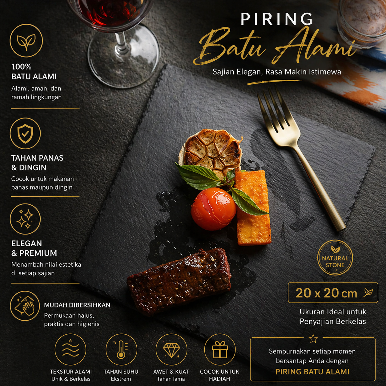 Piring batu alam Uibqut hadir dengan tampilan mewah, tekstur unik, dan ketahanan tinggi. Tersedia dalam enam ukuran. Cocok untuk berbagai hidangan, dari sushi hingga steak dan mudah dibersihkan. Ideal untuk sajian artistik dan elegan.