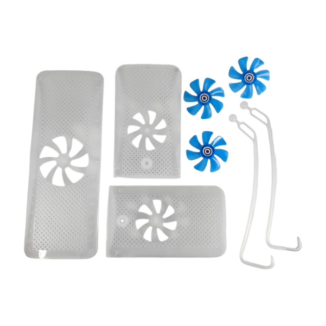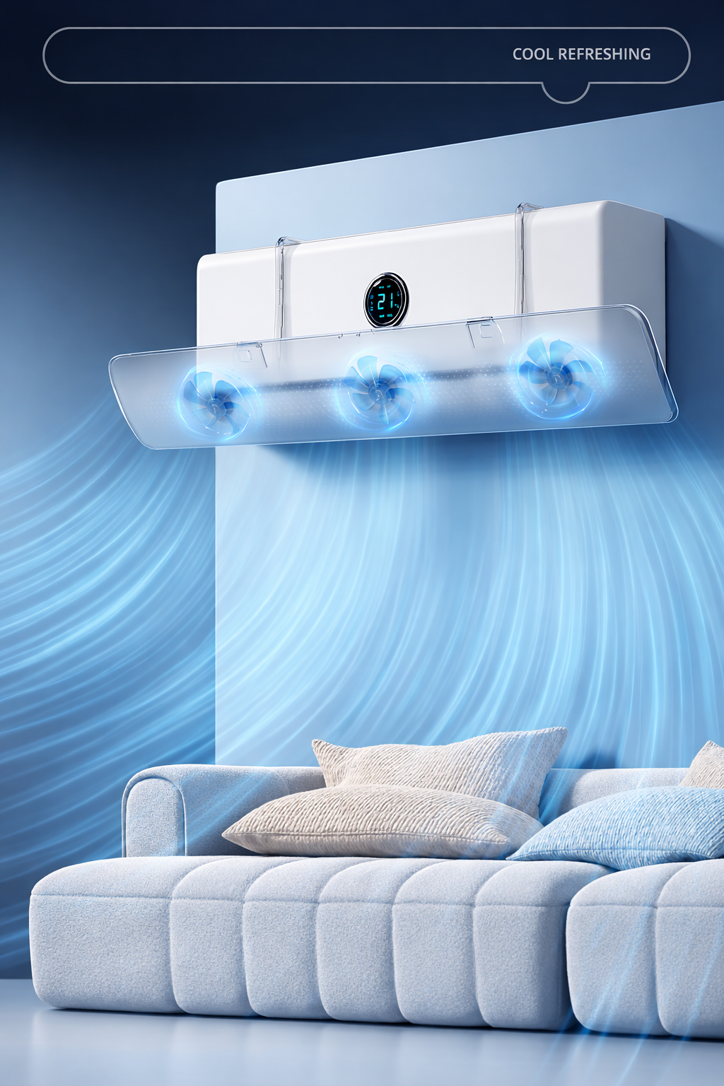 | Sistem 3 Kipas Mini untuk Sebaran Udara Lebih Lembut Produk ini dilengkapi tiga kipas mini berdiameter 10 cm yang membantu memecah hembusan udara dari AC menjadi lebih lembut. Kipas ini bekerja dengan cara membantu mengurai aliran udara sehingga tidak terasa terlalu tajam saat mengenai kulit. Dengan mekanisme ini, udara dingin tetap terasa menyegarkan namun tidak menyebabkan rasa terlalu dingin atau tidak nyaman. Sistem ini juga membantu meningkatkan sirkulasi udara di ruangan sehingga pendinginan terasa lebih merata. |