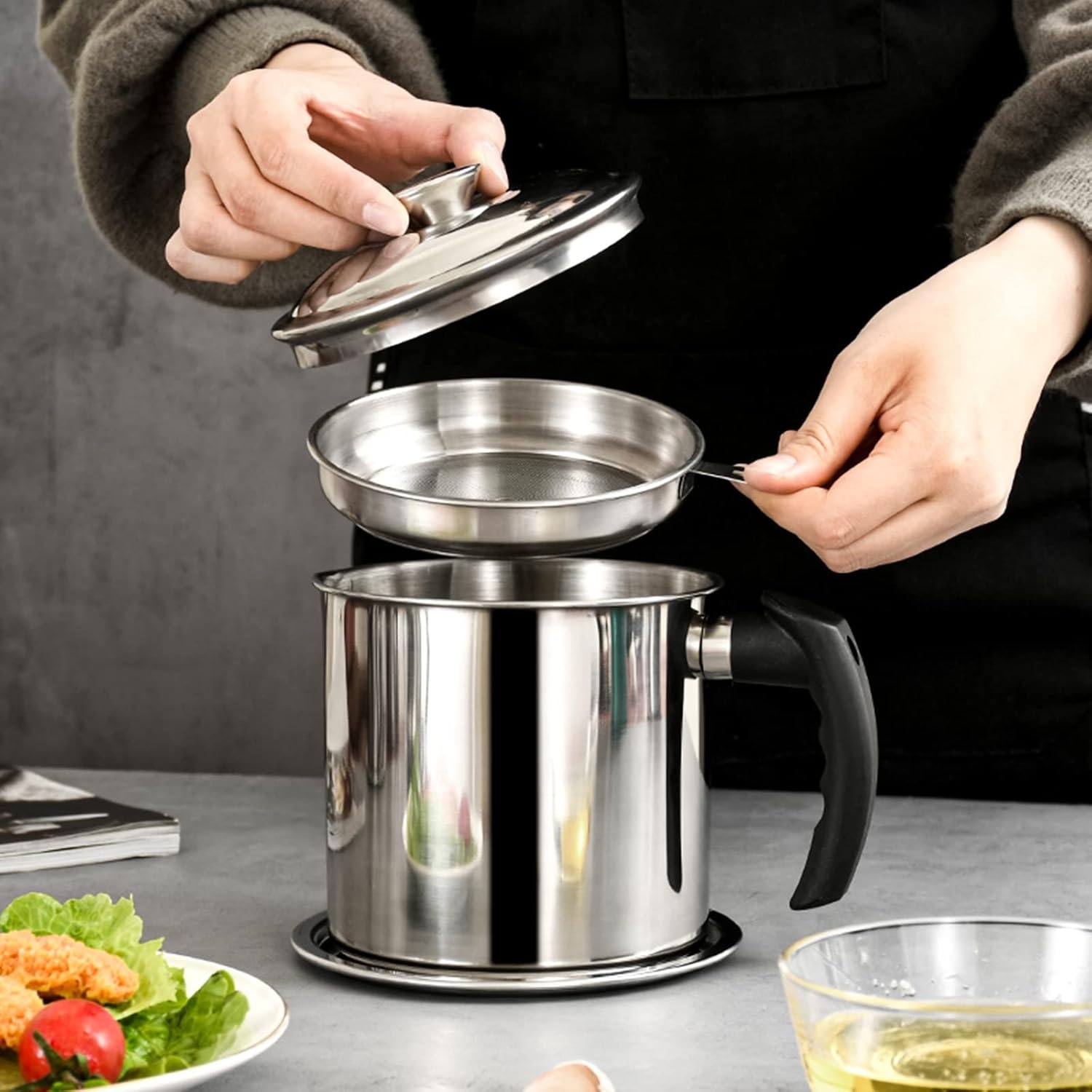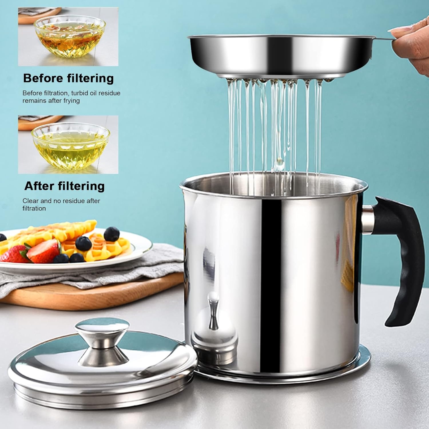 | Filter Mesh Halus Saring Tanpa Sisa Anda dapat memisahkan sisa gorengan yang paling halus sekalipun berkat penggunaan mesh penyaring yang sangat rapat dan presisi. Hasilnya, minyak yang Anda simpan akan kembali jernih dan siap digunakan kembali untuk proses memasak berikutnya tanpa ada ampas yang tertinggal. |