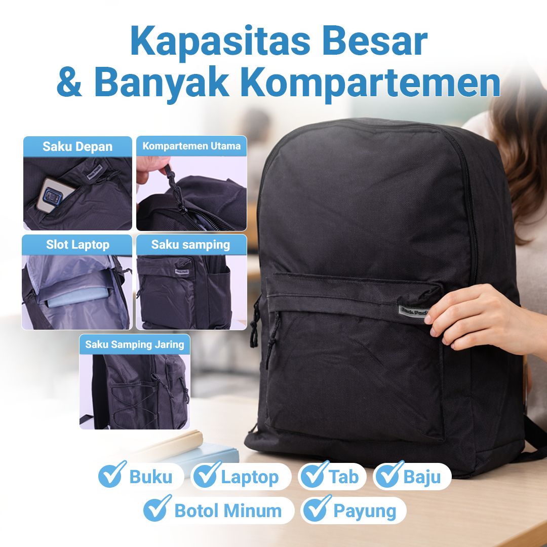 | Kapasitas Luas dan Kompartemen Lengkap Dilengkapi ruang utama yang lapang dengan kapasitas optimal, tambahan saku depan, dan kantong samping untuk botol minum. |