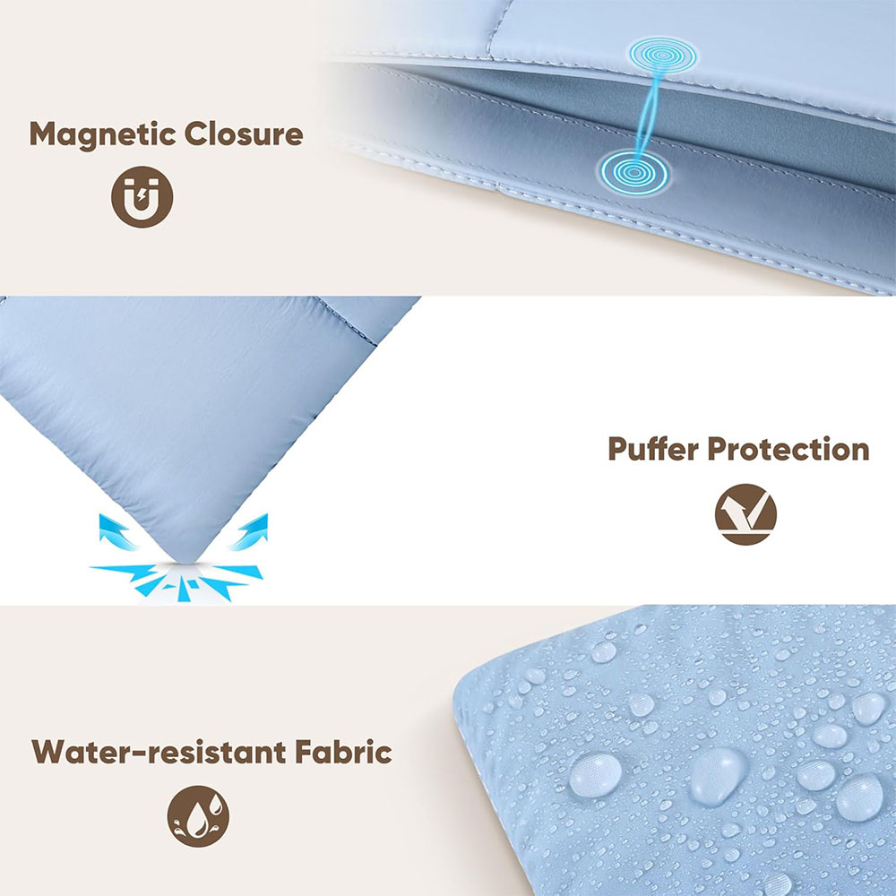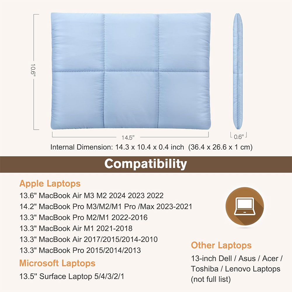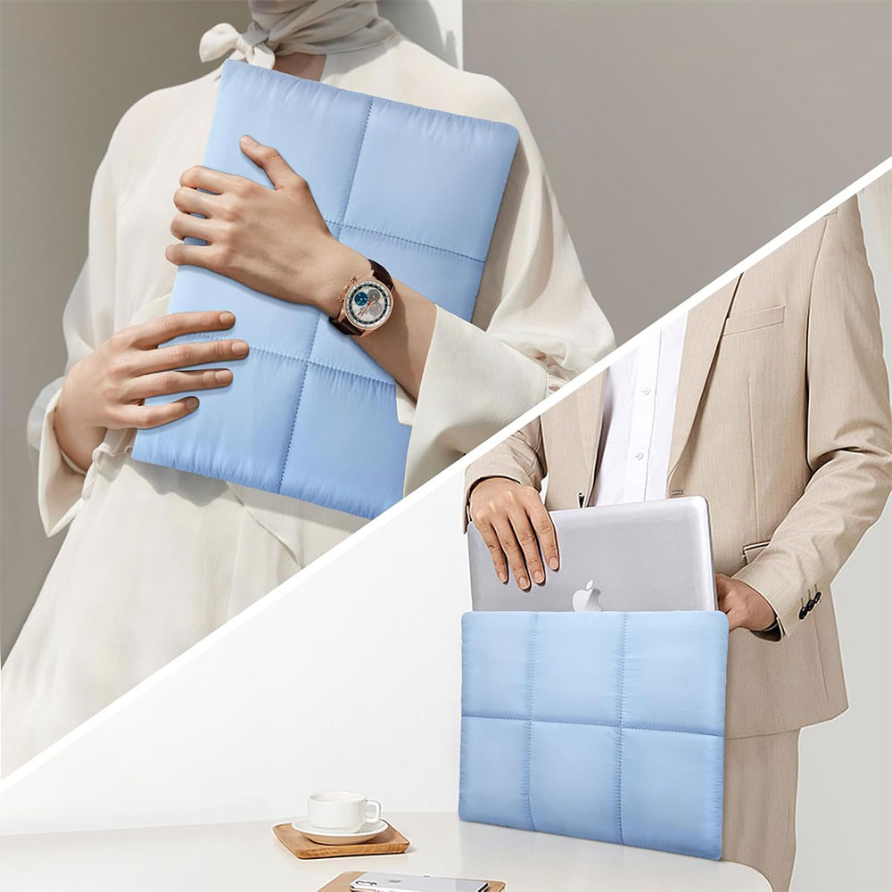 | Material Anti air dan Lining Fleece Bagian luar tas laptop sleeve puffy terbuat dari poliester kepadatan tinggi (high-density polyester) yang bersifat tahan air, sehingga laptop terlindungi dari cipratan minuman atau hujan ringan. Bagian dalam dilapisi fleece lembut yang menjaga permukaan laptop bebas dari goresan dan debu sehari-hari. Kombinasi dua material ini memastikan perlindungan menyeluruh dari luar maupun dalam. |