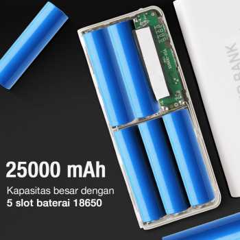 | Kapasitas Besar untuk Berbagai Kebutuhan Power bank case ini menyediakan 5 slot baterai 18650 flat top yang dapat dirakit sesuai kebutuhan. Kapasitas maksimal secara spesifikasi mencapai 25000 mAh, tergantung baterai yang digunakan. Cocok untuk penggunaan intensif seperti perjalanan jauh atau kondisi darurat. |
