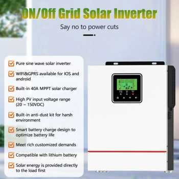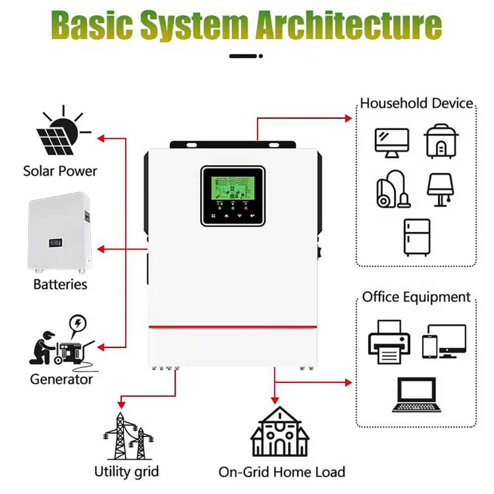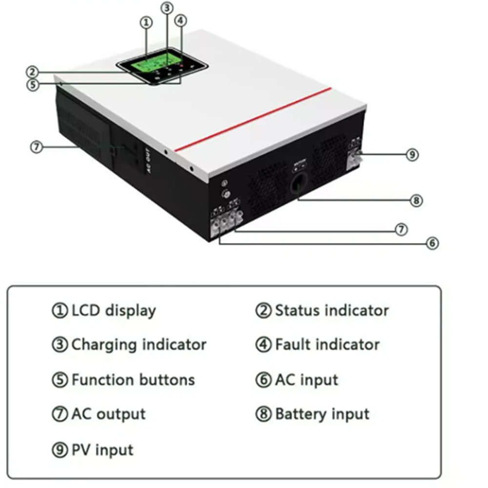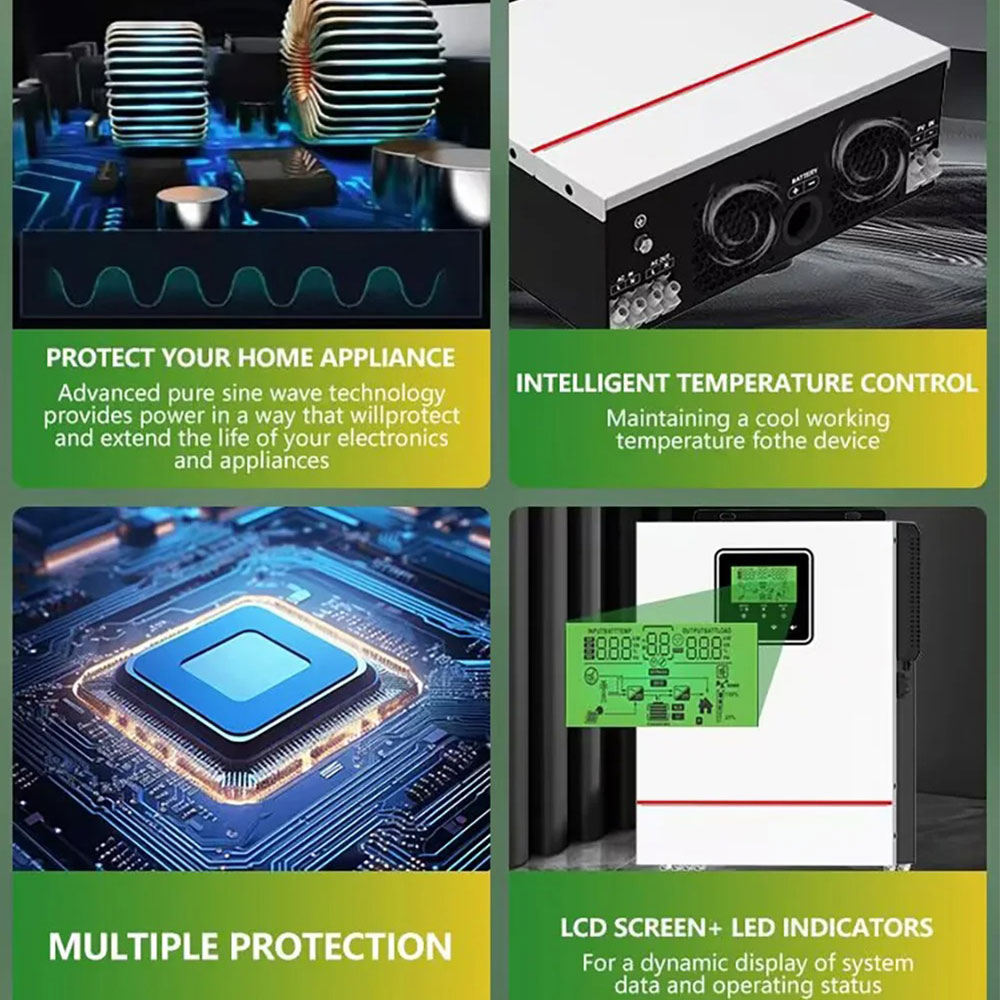| Pengaturan Sumber Listrik Inverter ini dirancang dengan sistem hybrid otomatis yang dapat bekerja menggunakan panel surya, baterai, serta sumber listrik cadangan dalam satu perangkat. Saat energi surya tersedia, inverter akan menggunakannya sebagai sumber utama. Ketika daya surya berkurang, sistem ini akan berpindah otomatis ke baterai atau sumber cadangan, sehingga penyimpanan listrik tetap stabil tanpa perlu pengaturan manual. |