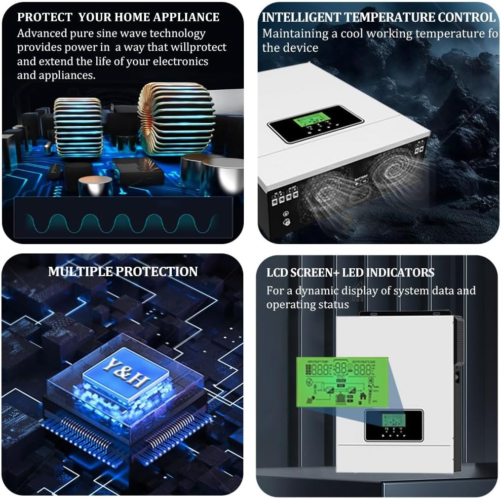 | Pengaturan Sumber Listrik Inverter ini dirancang dengan sistem hybrid otomatis yang dapat bekerja menggunakan panel surya, baterai, serta sumber listrik cadangan dalam satu perangkat. Saat energi surya tersedia, inverter akan menggunakannya sebagai sumber utama. Ketika daya surya berkurang, sistem ini akan berpindah otomatis ke baterai atau sumber cadangan, sehingga penyimpanan listrik tetap stabil tanpa perlu pengaturan manual. |