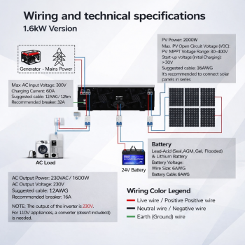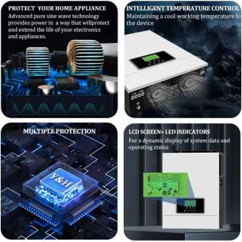 | Kontrol Daya Lebih Maksimal Selain sebagai inverter, alat ini juga dibekali teknologi MPPT yang berfungsi sebagai solar charge controller. Dengan teknologi tersebut, inverter mampu mengambil daya secara maksimum dari panel surya, juga mampu menyimpan kelebihan daya dan menyimpannya kembali ke dalam baterai. Voltase input yang dapat diterima dari panel surya juga luas, yakni DC 30 - 400 V. |