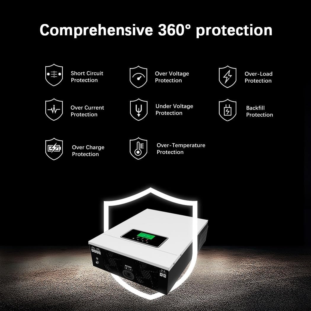 | Proteksi Keamanan Lengkap Dilengkapi perlindungan otomatis terhadap beban berlebih, panas berlebih, tegangan tinggi dan rendah, korsleting, arus berlebih serta kesalahan polaritas baterai. Inverter dan perangkat listrik tetap aman, stabil dan tahan lama. |