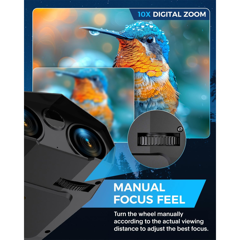 | Zoom Digital hingga 10x Fitur 10x digital zoom memungkinkan Anda memperbesar objek dari jarak jauh tanpa kehilangan detail penting. Sangat ideal untuk observasi satwa liar, keamanan malam, pencarian lokasi, hingga aktivitas outdoor yang membutuhkan ketelitian visual tinggi. |