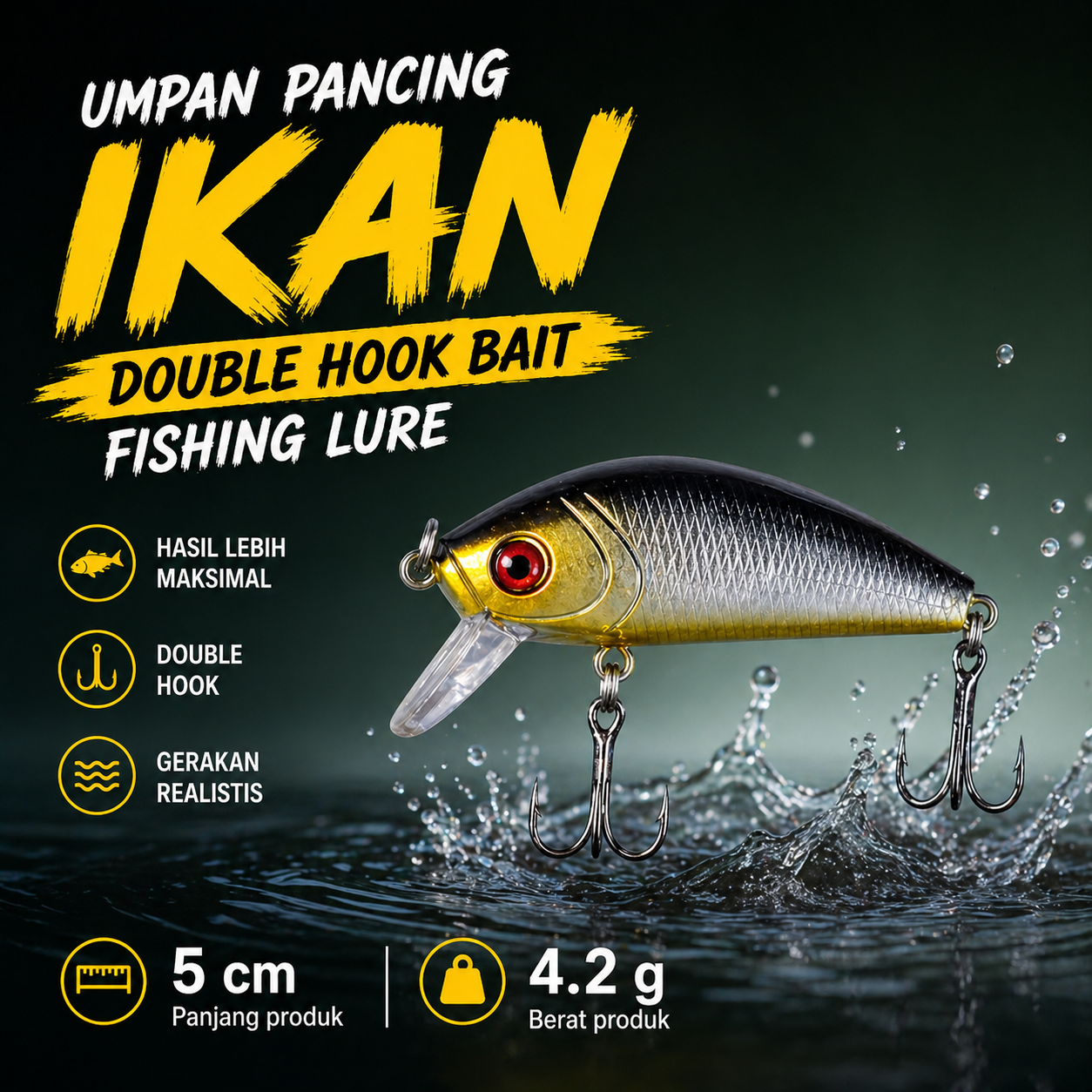 | Double Hook Tajam dan Anti Lepas Dilengkapi dua kail tajam pada bagian tengah dan ekor untuk meningkatkan peluang hook-up. Kombinasi treble hook membuat ikan lebih sulit lepas setelah menggigit. Sangat efektif untuk meningkatkan hasil tangkapan. Cocok untuk target ikan kecil hingga predator. |