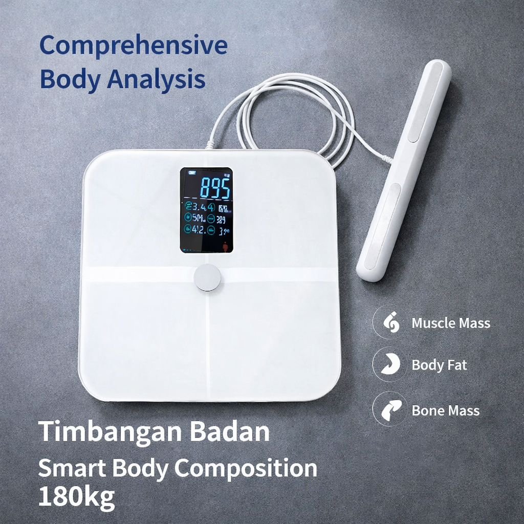 | 8 Elektroda untuk Presisi Maksimal Berbeda dari timbangan biasa yang hanya menggunakan 4 sensor di kaki, timbangan digital ini dilengkapi 8 elektroda, 4 untuk kaki dan 4 untuk tangan menggunakan handle. Teknologi ini memungkinkan pengukuran yang jauh lebih akurat karena sinyal bioelektrik melewati seluruh tubuh, memberikan hasil yang konsisten dan detail, bahkan mendekati standar alat profesional. |