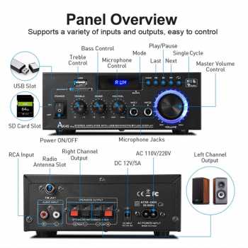 | Input Lengkap untuk Banyak Kebutuhan Amplifier ini mendukung banyak pilihan input seperti Bluetooth, USB, SD Card, RCA, dan MIC, serta dilengkapi FM Radio. Anda bisa menikmati musik dari flashdisk hingga 64 GB dengan format MP3, WMA, APE, FLAC, dan WAV, atau menggunakannya untuk karaoke dan acara keluarga dengan mikrofon. |