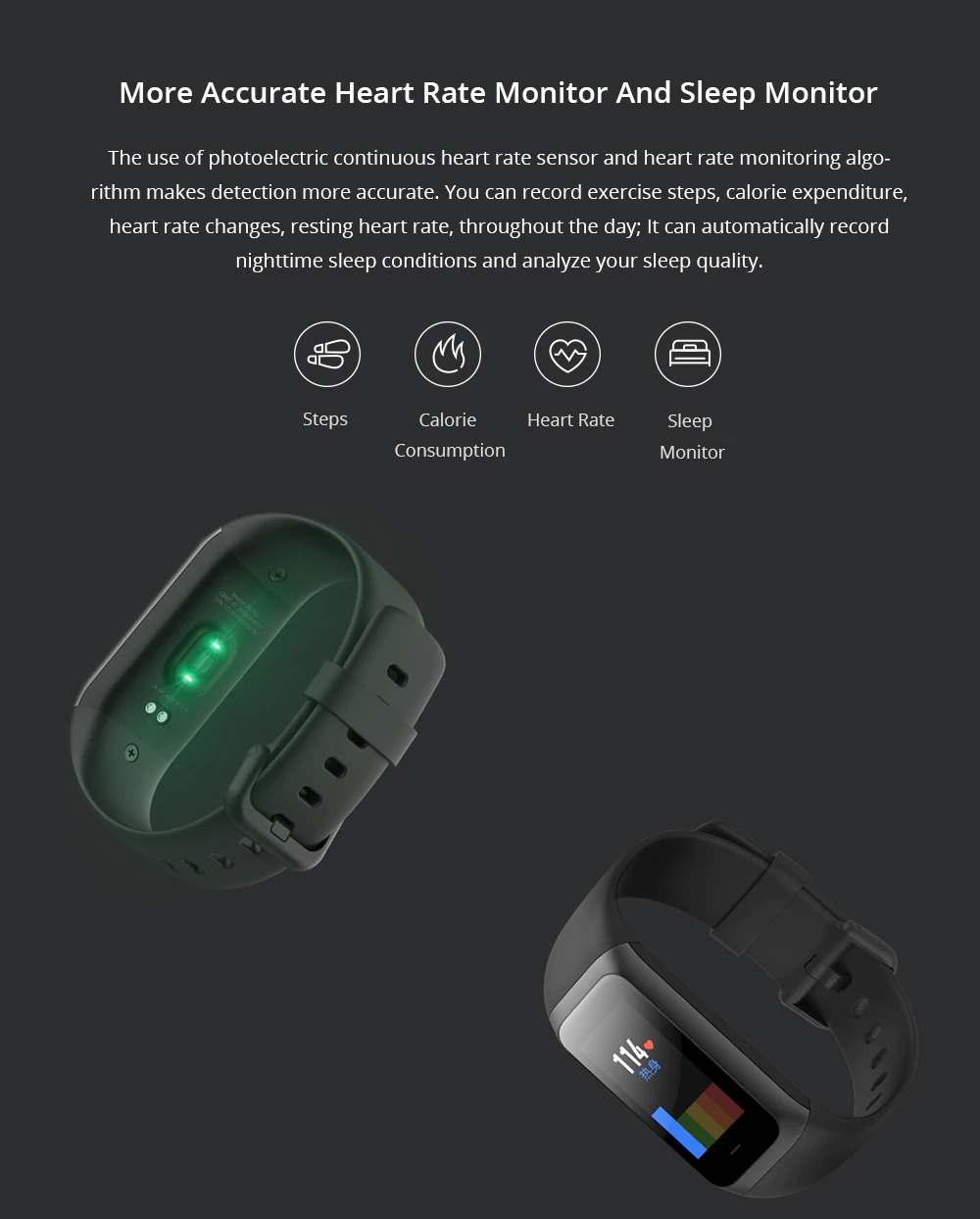 | Heart Rate Monitor and Sleep Monitor Sensor photoelectric yang disematkan pada jam tangan ini memungkinkan deteksi jantung dengan lebih akurat sehingga Anda dapat selalu memonitoring detak jantung Anda saat berolahraga ataupun saat tidur karena alat ini juga dapat menganalisa kualitas tidur Anda setiap hari.