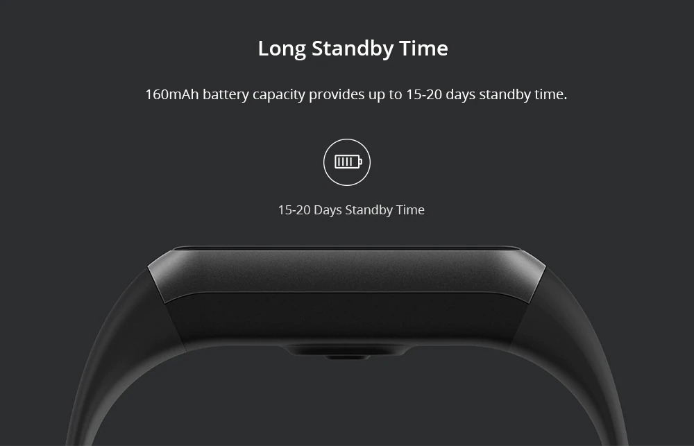 | Long Standby Time Dalam hal durabilitas, Amazfit Band Cor 2 ini disokong dengan baterai yang awet dan tahan lama sehingga dapat menyala 15 hingga 20 hari lamanya dalam mode standby. Dengan begitu Anda tidak perlu report sering mengecas baterai smartwatch ini.