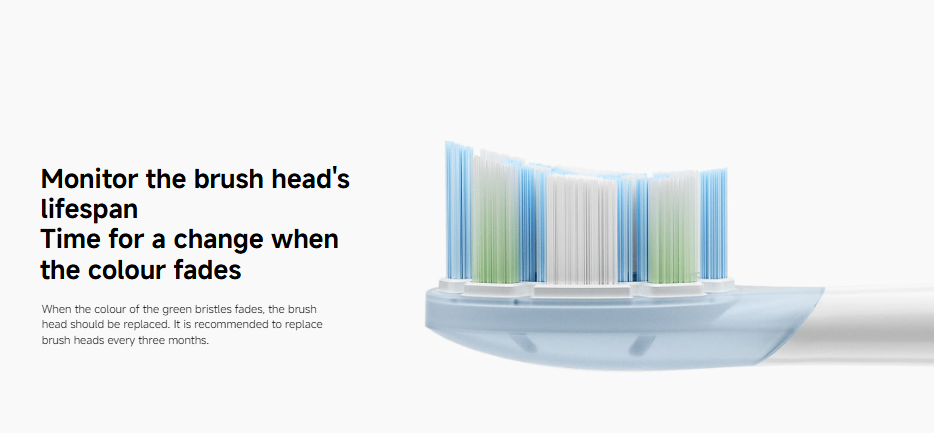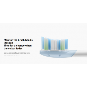 | Perlindungan Gusi dan Indikator Penggantian Kepala sikat ini dilengkapi dengan lapisan Soft rubber head yang elastis untuk meredam getaran dan mencegah benturan keras yang tidak nyaman pada gigi. Untuk menjaga efektivitas pembersihan, terdapat fitur Colour-fading bristles di mana warna bulu sikat hijau akan memudar seiring pemakaian. Pengguna disarankan untuk mengganti kepala sikat setiap tiga bulan atau ketika warna indikator tersebut sudah mulai hilang. |