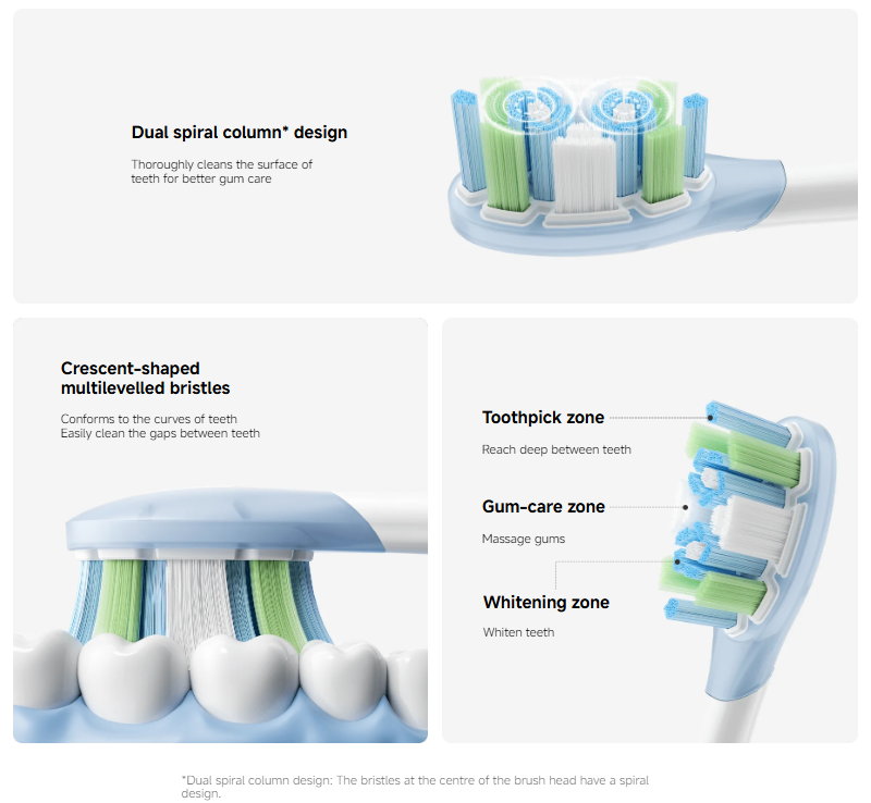 | Desain Pembersihan Mendalam dan Ergonomis Kepala sikat ini menggunakan desain Crescent-shaped multilevelled bristles yang melengkung untuk mengikuti kontur alami gigi manusia. Bentuk ini memungkinkan bulu sikat untuk menjangkau dan membersihkan sela-sela gigi yang sulit diakses dengan lebih efektif. Selain itu, terdapat pembagian zona khusus seperti Toothpick zone untuk pembersihan mendalam, Gum-care zone untuk memijat gusi, dan Whitening zone untuk membantu memutihkan gigi. |