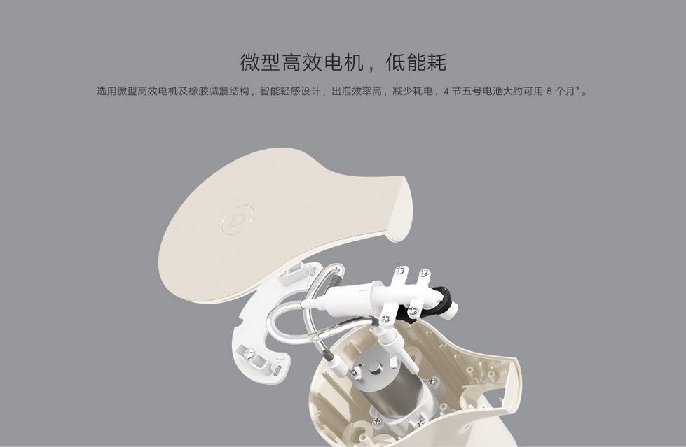 Xiaomi membuat mesin dispenser sabun ini agar bekerja dengan sangat efisien dan juga hemat tenaga. Ditenagai menggunakan baterai AA. Mesin ini juga tidak berisik saat bekerja.