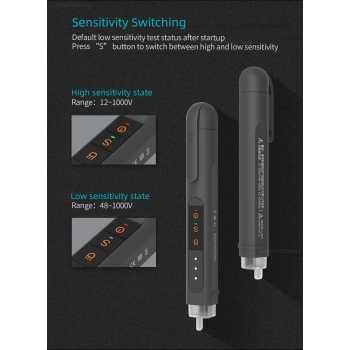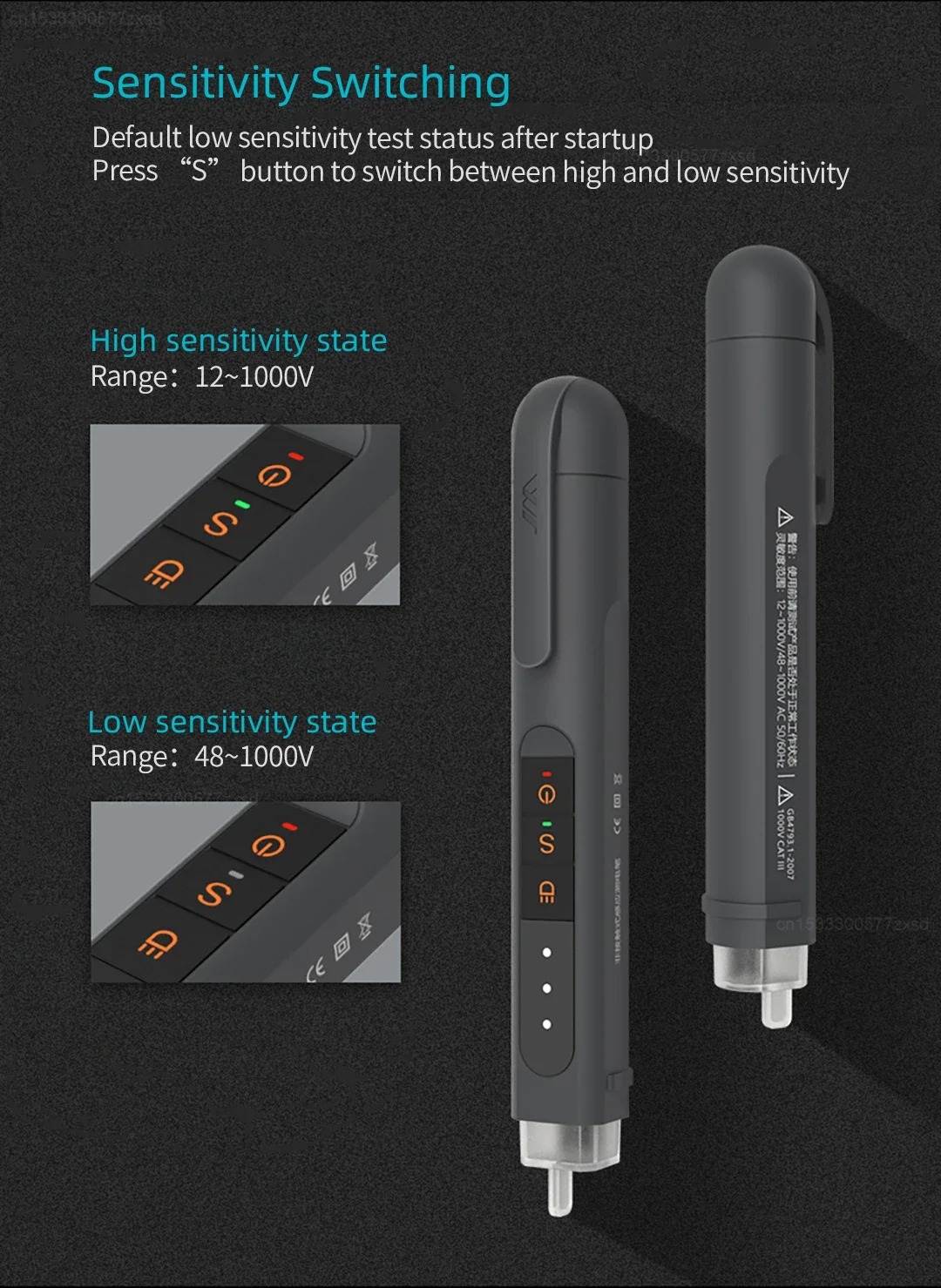 | Akurasi Tinggi dengan Range 12/48 - 1000 V Test pen Xiaomi Mijia Jimihome memiliki akurasi tinggi dengan range yang luas yakni 12/48 - 1000 V. Anda juga dapat mengatur sensitivitas deteksi secara manual dengan tombol "S", menjadi mode low sensitivity (48 - 1000 V) atau high sensitivity (12 - 1000 V). Kabel dengan tegangan rendah tetap dapat terdeteksi dengan test pen. |