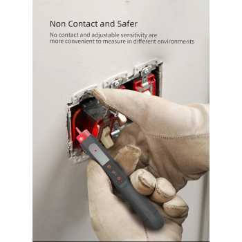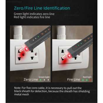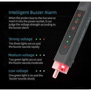 | Alarm Audio dan Visual yang Pintar Saat detektor mendeteksi kekuatan voltase pada kabel listrik, alarm audio dan visual akan berbunyi. Jika voltase tinggi, 3 lampu indikator akan menyara dan ada bunyi buzz yang cepat. Jika voltase sedang, 2 lampu hijau akan menyala. 1 Lampu hijau akan menyala jika voltase rendah. |