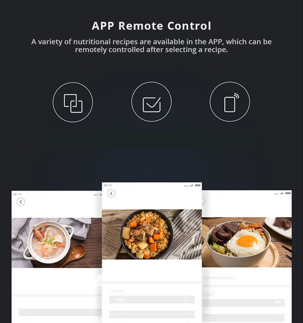 | MI App to Control all Function Fitur utama yang membuat rice cooker ini berbeda dari yang lain adalah kemampuannya untuk terhubung ke smartphone melalui aplikasi MI. Fitur ini membuat MiJia Rice Cooker dapat mengakses berbagai fungsi lain mulai dari pengaturan tingkat kematangan dan tekstur nasi yang diinginkan hingga berbagai tips memasak.