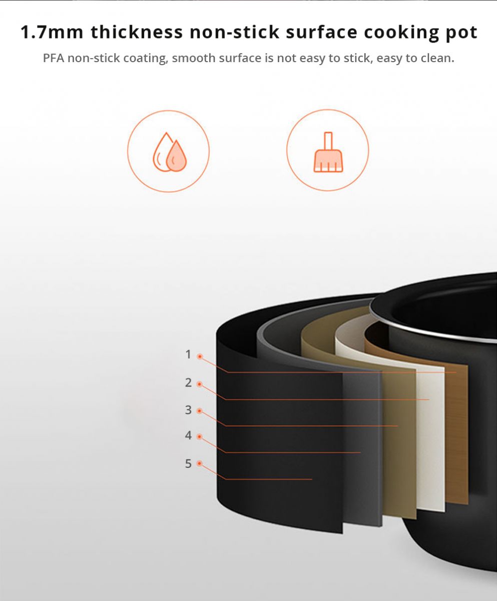 | Food-Grade Non-Stick Coating from Daikin Pot yang berada di dalam Xiaomi MiJia Rice Cooker terbuat dari Grey Cast Iron yang dilapisi dengan lapisan non-stick Food-Grade dari Daikin. Penggunaan Cast Iron membuat rice cooker ini dapat memasak nasi dengan suhu yang maksimal dan matang merata. Lapisan non-stick yang digunakan sudah food-garde sehingga sangat aman digunakan untuk peralatan memasak.