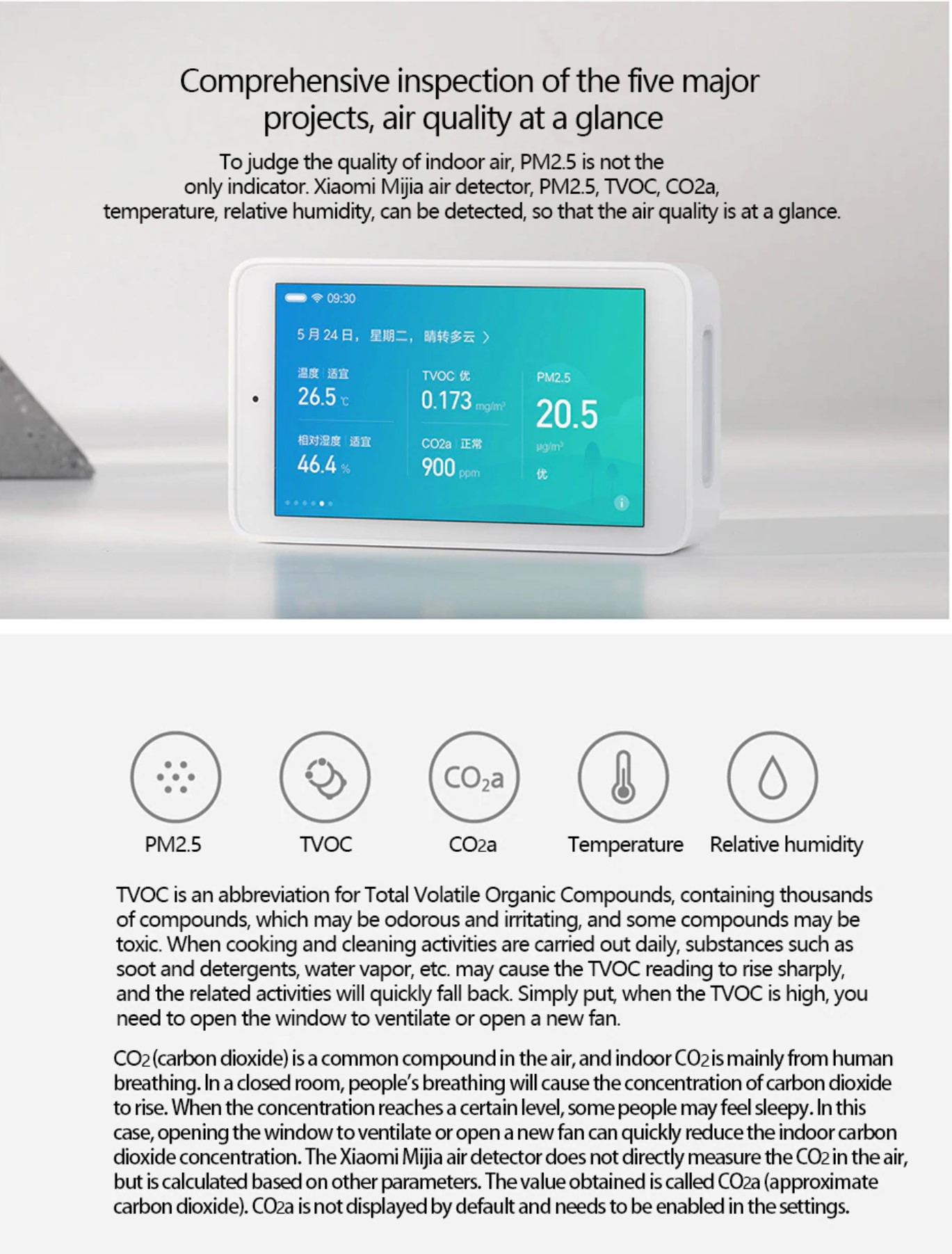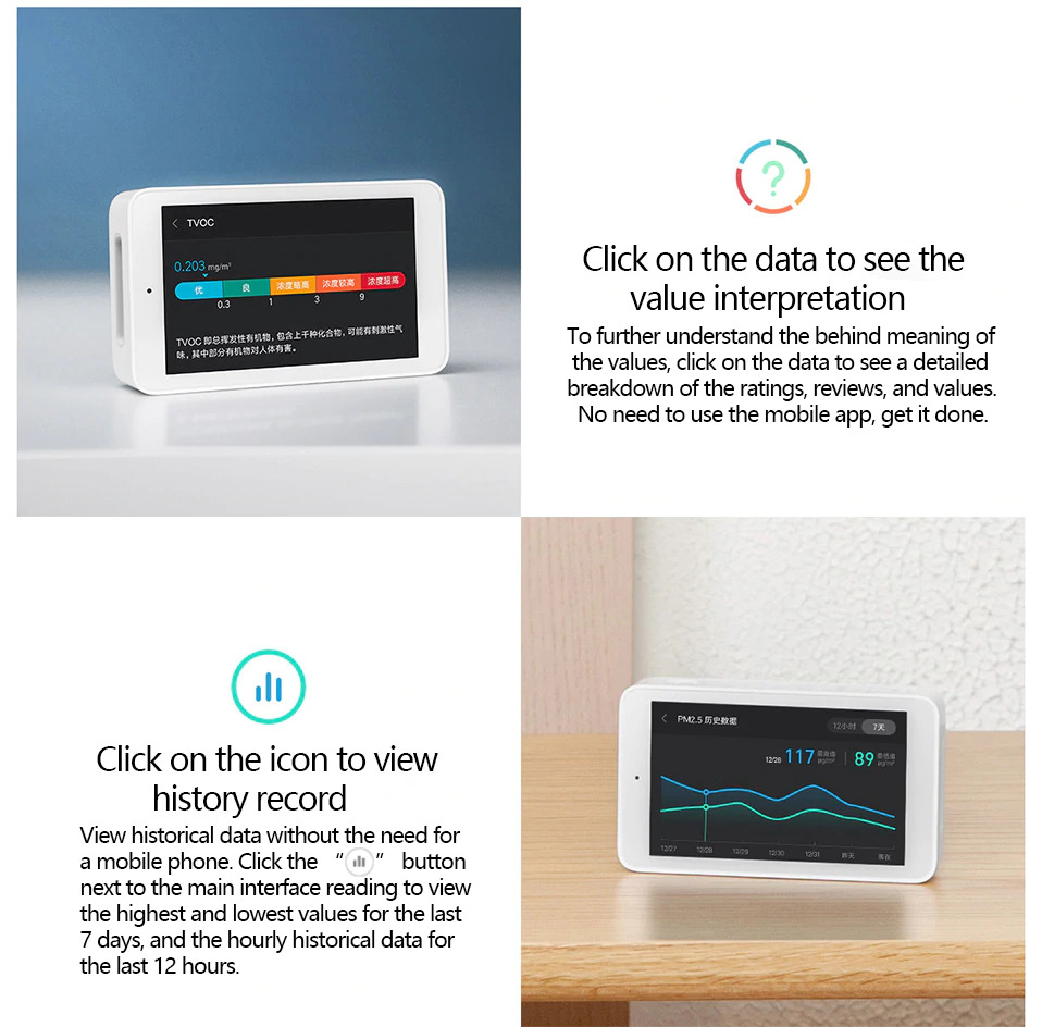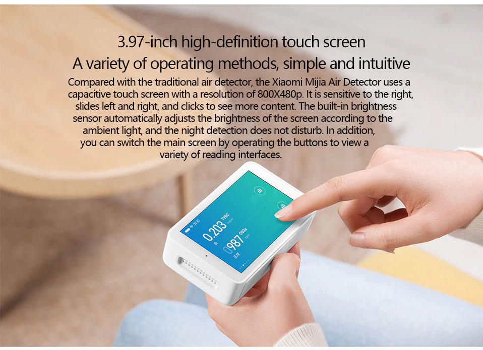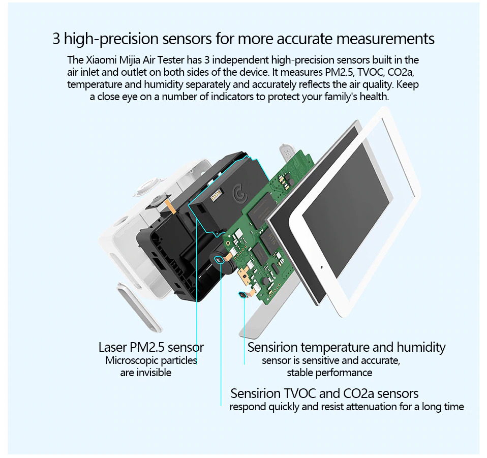 | 3 High-precision Sensors Air Detektor iini memiliki 3 sensor utama yaitu Laser PM2.5 sensor, TVOC and C02a Sensors dan Temperature and humidity sensor. Ketiga sensor tersebut dapat mengukur secara akurat tingkat kualitas udara, jumlah karbondioksida, serta tingkat kelembaban dan temperatur yang ada di sekitar Anda. Berbagai fungsi tersebut dikemas menjadi satu dalam produk Xiaomi ini.