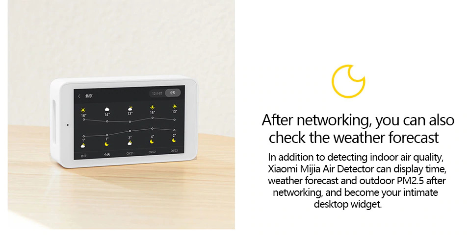 | 3.97-inch HD Touch Screen Display Alat detektor udara ini dilengkapi dengan layar touch screen dengan resolusi HD sehingga Anda dapat mengontrol dengan mudah kualitas udara dan temperatur di rumah Anda. Anda juga bisa melihat history record data yang telah Anda kumpulkan langsung dalam pengaturan yang ada di layar touch screen ini. Terdapat juga fitur weather forecast layaknya fitur yang biasa tersedia di smartphone.