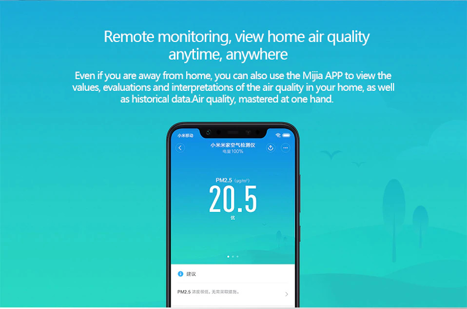 | Remote Monitoring Anda juga bisa menghubungkan alat detektor ini dengan smartphone menggunakan aplikasi Mijia APP sehingga dapat Anda mengontrol secara real-time kualitas udara langsung lewat smartphone meski Anda berada di luar kota. Dengan Mijia APP ini Anda juga dapat mengontrol berbagai perlengkapan lainnya seperti humidifier, air purifier sehingga alat detektor ini dapat terhubung satu sama lain dengan perangkat tersebut dan menjadikannya berjalan secara otomatis.