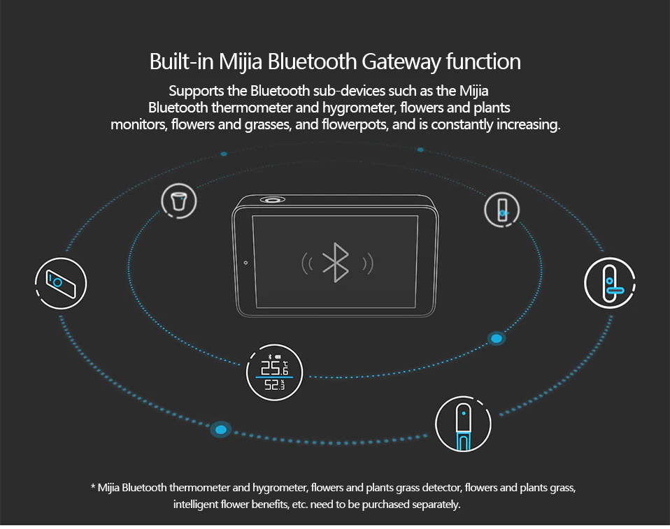 | Built-in Mijia Bluetooth Gateway Function Dengan fungsi built-in Mijia Bluetooth. gateway, Anda dapat menghubungkan perangkat seperti termometer dan hygrometer yang Anda miliki sehingga Anda dapat merawat tanaman Anda di rumah secara otomatis langsung dengan alat canggih ini.