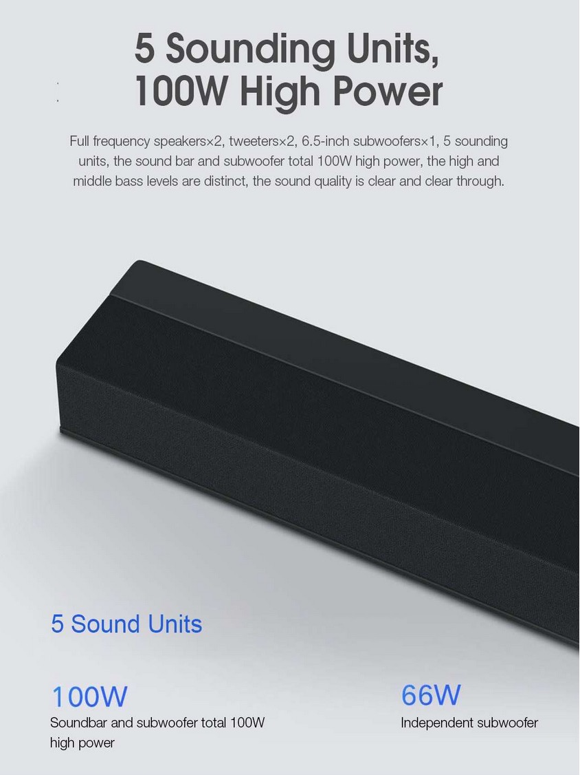 | 5 Sounding Unit, Daya Tinggi 100 W Xiaomi mendesain home theater ini sedemikian rupa untuk memberikan kualitas audio terbaik di ruang keluarga Anda. Penggunaan unit soundbar yang dipadukan dengan speaker 2 drive dan subwoofer 6.5 Inch membuat home theater ini mampu menghasilkan suara imersif yang kuat, bulat, dan tingkat detil yang tinggi. Soundbar ini dapat menghasilkan output suara total 100 W.