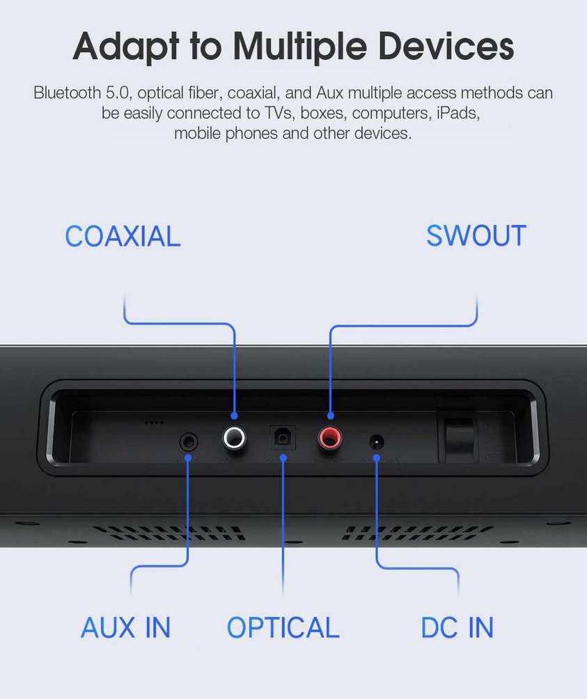 | Hubungkan ke Banyak Perangkat Untuk mempermudah Anda, Xiaomi melengkapi home theater ini dengan koneksi Bluetooth 5.0 dan beberapa koneksi kabel seperti optical fiber, coaxial, dan AUX. Anda dapat memasang beberapa unit audio player ke soundbar Xiaomi ini tanpa masalah.