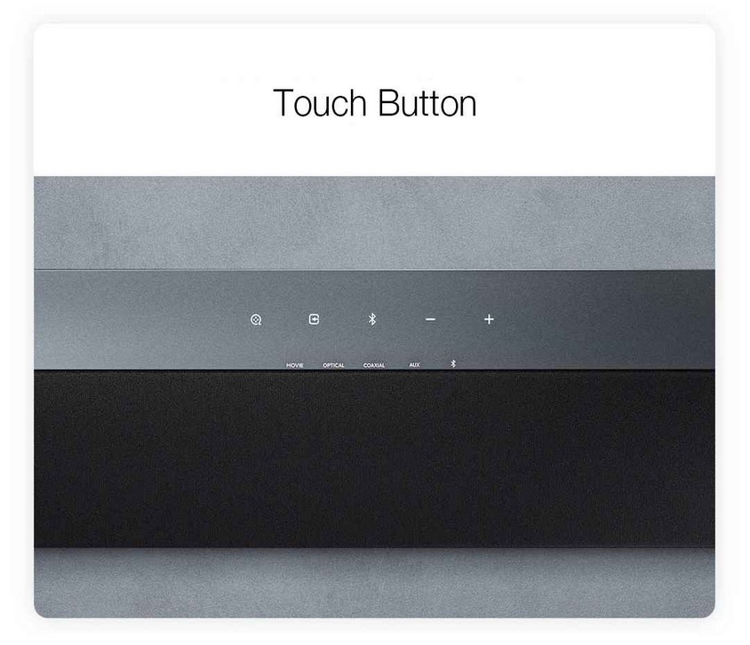 | Tombol Sentuh Home theater Xiaomi ini memiliki tombol-tombol sentuh sehingga tidak ada lagi tombol fisik pada body soundbar. Desain touch button ini membuat tampilan soundbar lebih minimalis dan indah untuk dipajang pada setup audio ruang tamu Anda.