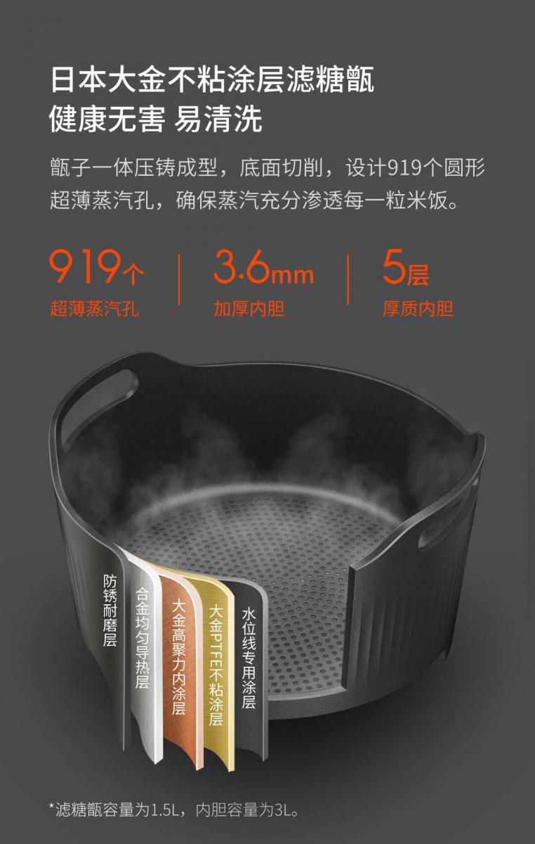Pot yang berada di dalam Xiaomi Rice Cooker terbuat dari Grey Cast Iron yang dilapisi dengan lapisan non-stick Food-Grade dari Daikin. Penggunaan Cast Iron membuat rice cooker ini dapat memasak nasi dengan suhu yang maksimal dan matang merata. Lapisan non-stick yang digunakan sudah food-garde sehingga sangat aman digunakan untuk peralatan memasak.