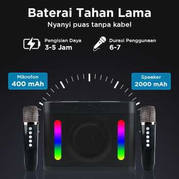 | Karaoke dengan Mudah Speaker bluetooth karaoke juga dilengkapi dengan 2 microphone wireless yang bisa digunakan untuk berkaraoke. |
