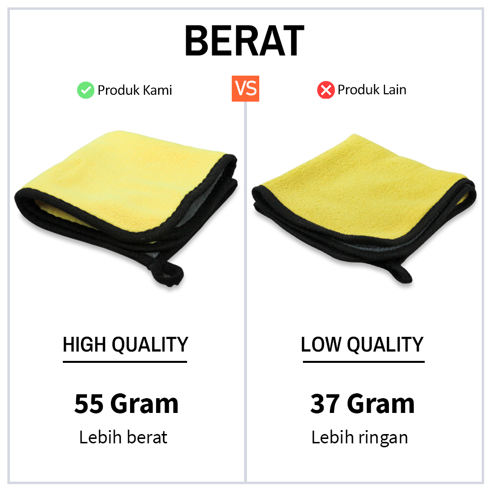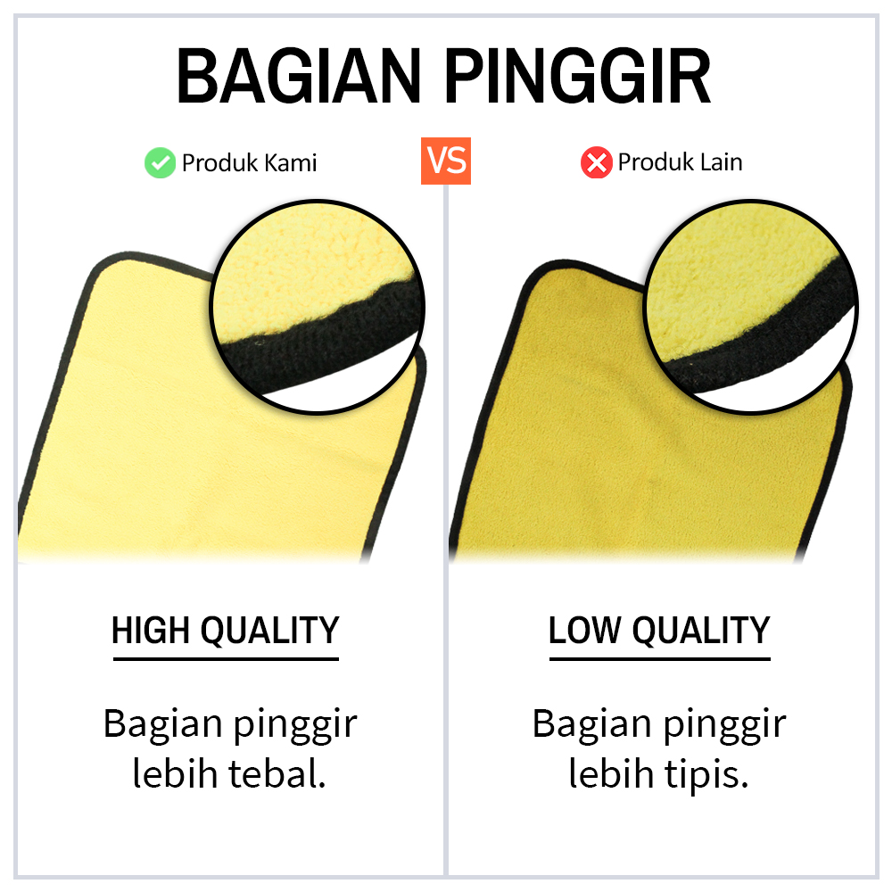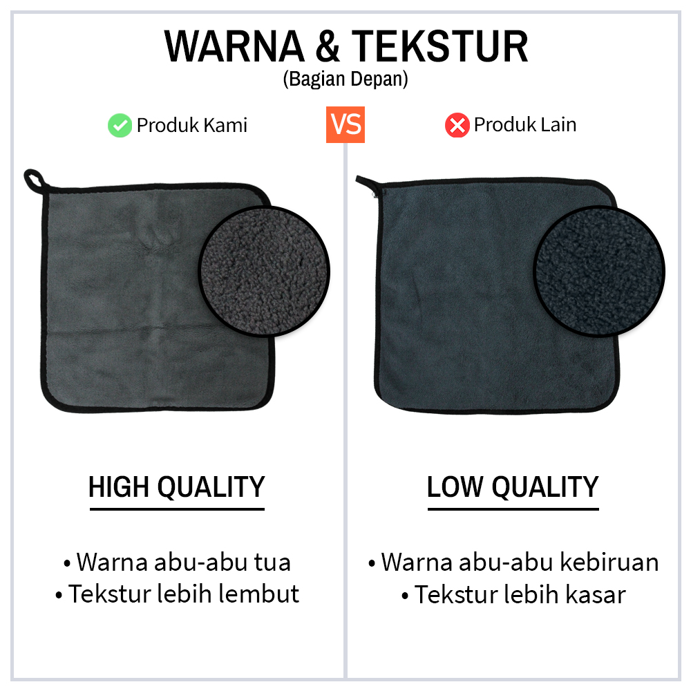 Material Premium Kualitas Tinggi Berkat permukaan kain microfiber yang sangat lembut, Anda tidak perlu khawatir bodi mobil atau barang yang sedang dibersihkan menjadi rusak atau lecet. Selain itu, bagian pinggir dan gantungannya dirancang menggunakan material kain premium yang tebal sehingga membuat kain microfiber ini lebih awet dan bisa digunakan dalam jangka waktu yang lama. |