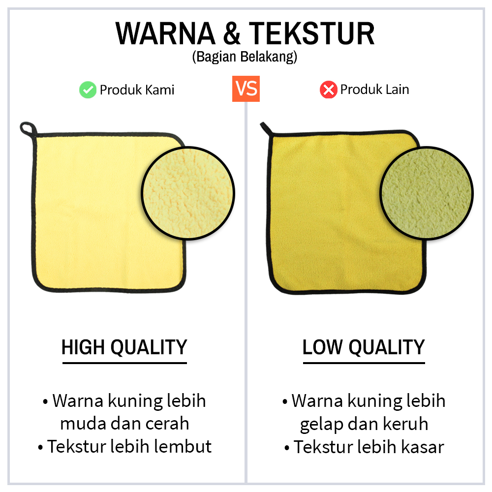 Terdapat 2 jenis kualitas kain microfiber, yakni low quality dan high quality. Berbeda dengan produk low quality yang ada di pasaran, kain microfiber ini memiliki ketebalan optimal sehingga tidak mudah rusak dan jauh lebih awet. Teksturnya pun lebih lembut untuk mengusap berbagai permukaan benda. Agar tidak terkecoh dengan produk yang beredar, Anda bisa memperhatikan beberapa detail perbedaan antara kain microfiber high quality dan low quality pada gambar berikut ini.
