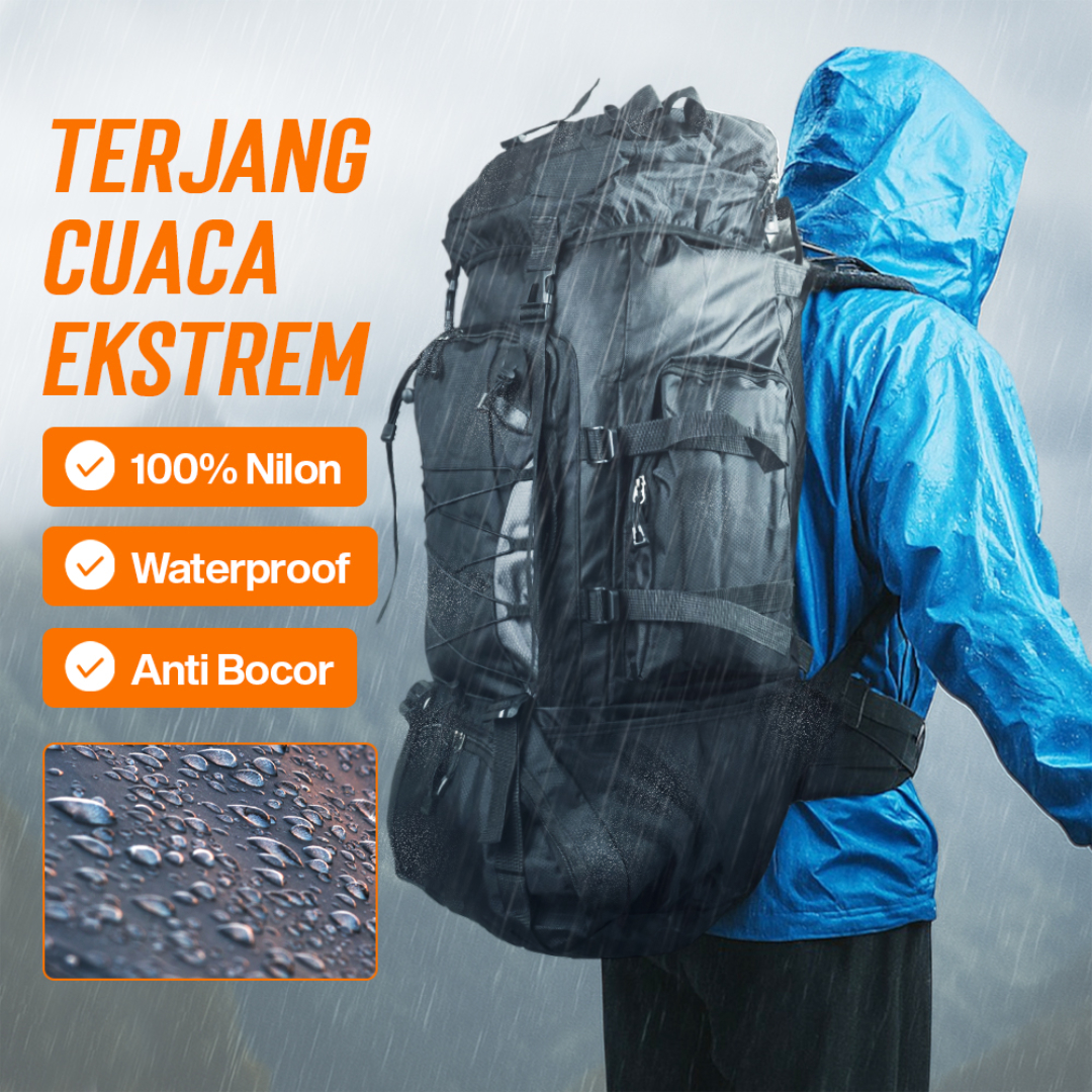 | Terjang Cuaca Ekstrem Bahan nilon tebal dengan lapisan PU tahan air melindungi isi tas dari guyuran hujan dan embun tebal. Resleting utama dilapisi water-resistant coating untuk menahan rembesan air. Pelindung hujan terintegrasi di kompartemen bawah siap ditarik kapan saja, memberikan perlindungan ekstra ketika cuaca benar-benar tidak bersahabat. |