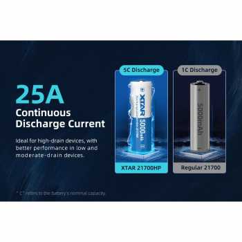 | Arus Pelepasan Tinggi Baterai rechargeable dari XTAR memiliki arus pelepasan tinggi hingga 25 A. Artinya, baterai mampu menyuplai daya besar secara stabil tanpa penurunan performa, bahkan saat digunakan pada perangkat high-drain seperti bor listrik, senter LED high power, vape mod, atau peralatan elektronik profesional. |