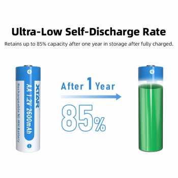 | Jaga Kapasitas Jangka Panjang Baterai rechargeable dari XTAR dibekali dengan fitur Low Self Discharge yang mampu menahan daya baterai dalam jangka waktu yang lama. Baterai dengan fitur LSD mampu mempertahankan kapasitas sebanyak 85% dalam setahun meski tidak digunakan. Jadi Anda tetap bisa menggunakan baterai meskipun baterai sudah disimpan selama 1 tahun. |