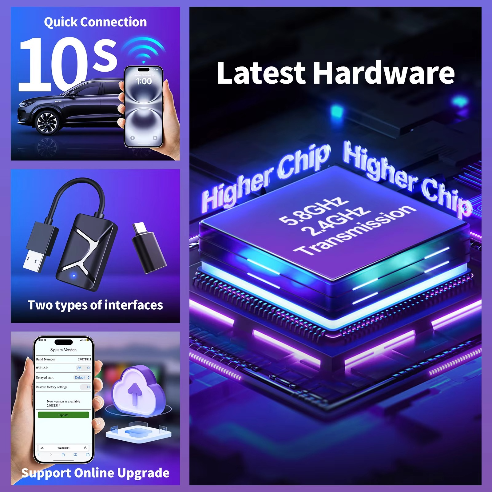 | Desain Kompak dan Portabel Dengan desain minimalis dan ringan, wireless CarPlay tidak mengganggu interior mobil Anda. Mudah disimpan, mudah dipasang, dan praktis untuk dibawa ke mobil mana pun yang kompatibel. Kompatibel dengan berbagai merk dan tipe smartphone kecuali Android versi domestik (China ROM). |