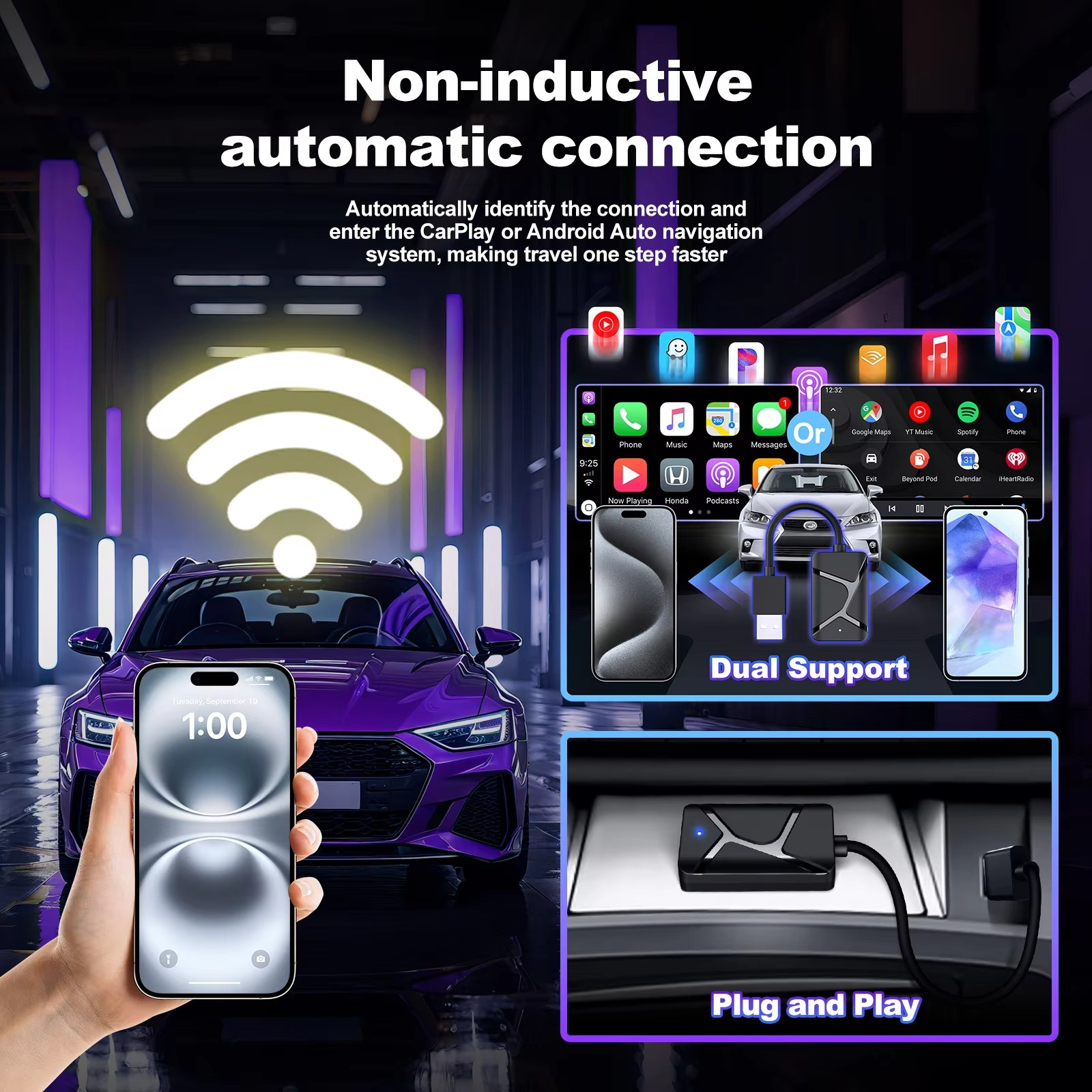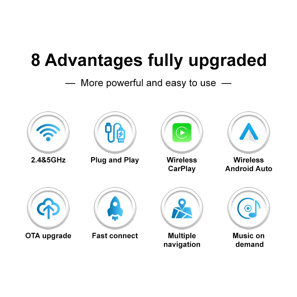 | Tanpa Kabel Lebih Ringkas Lepaskan kabel dan nikmati CarPlay serta Android Auto secara nirkabel. Dongle ini memungkinkan Anda mengakses navigasi, musik, panggilan, dan pesan langsung dari layar mobil tanpa harus mencolokkan kabel. Cukup sambungkan sekali, dan sistem akan terhubung otomatis setiap kali Anda masuk ke mobil. |
