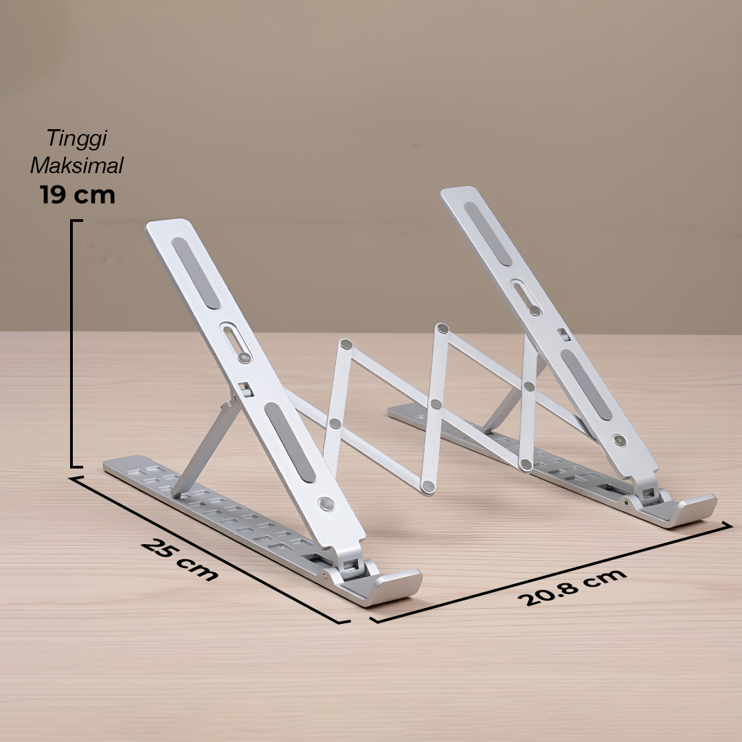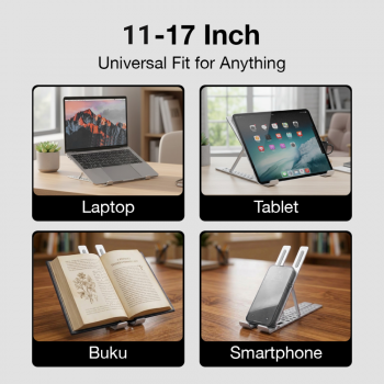 | Ukuran Universal untuk Semua Menawarkan ukuran universal, gunakan stand laptop untuk meletakkan berbagai barang. Mulai dari smartphone, tablet, buku, hingga laptop 17 Inch, semua bisa Anda letakkan di atas stand ini. |